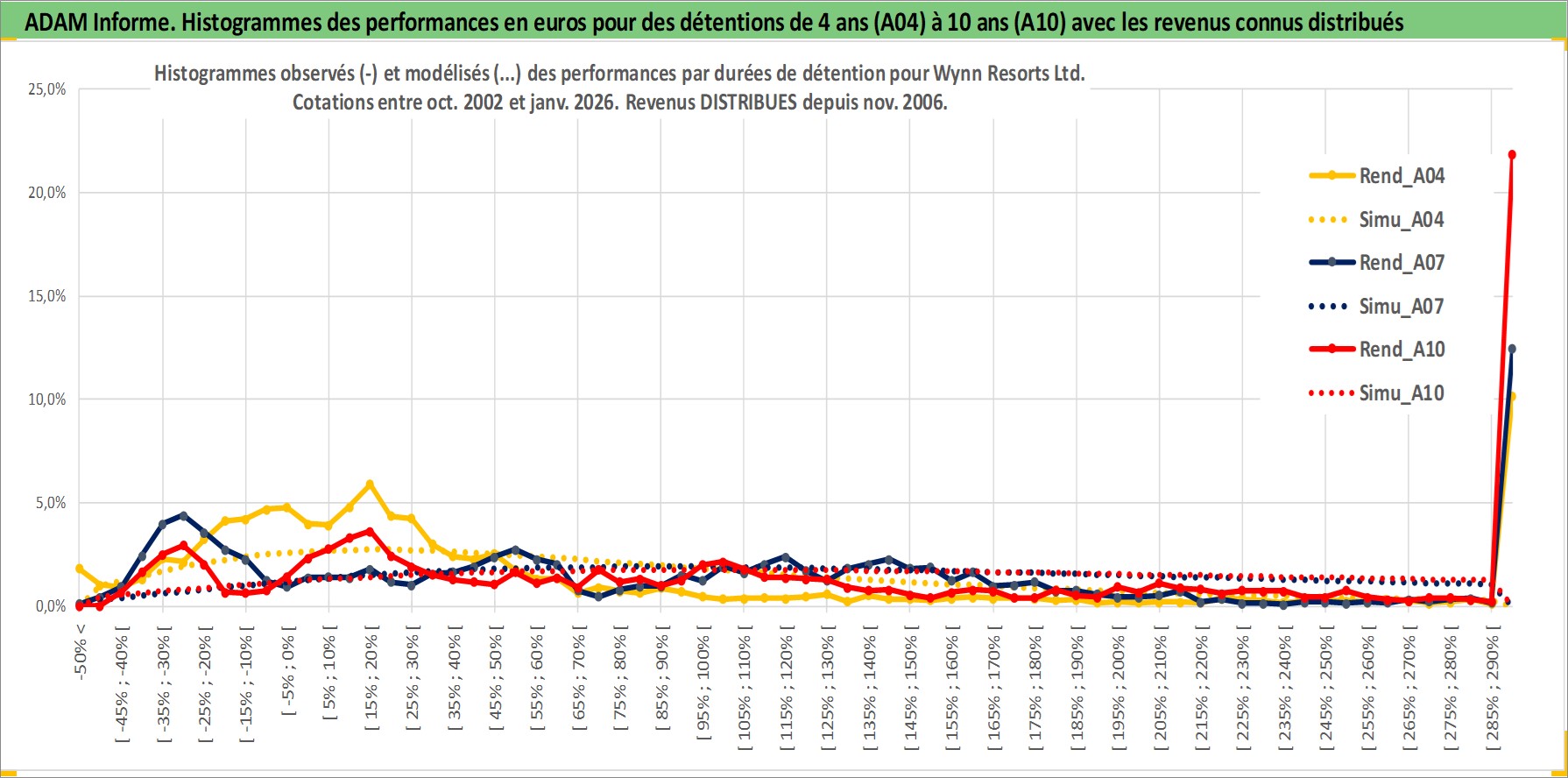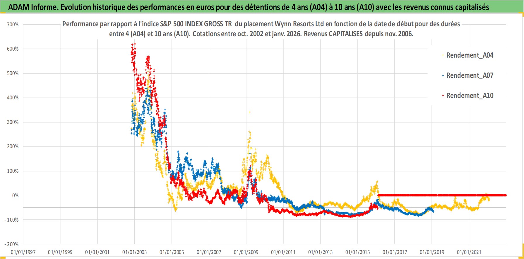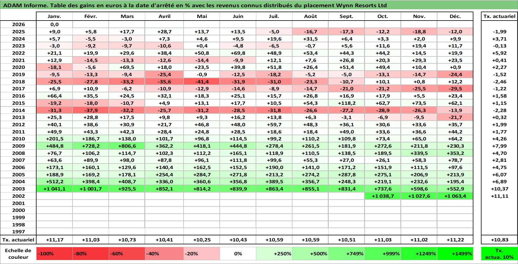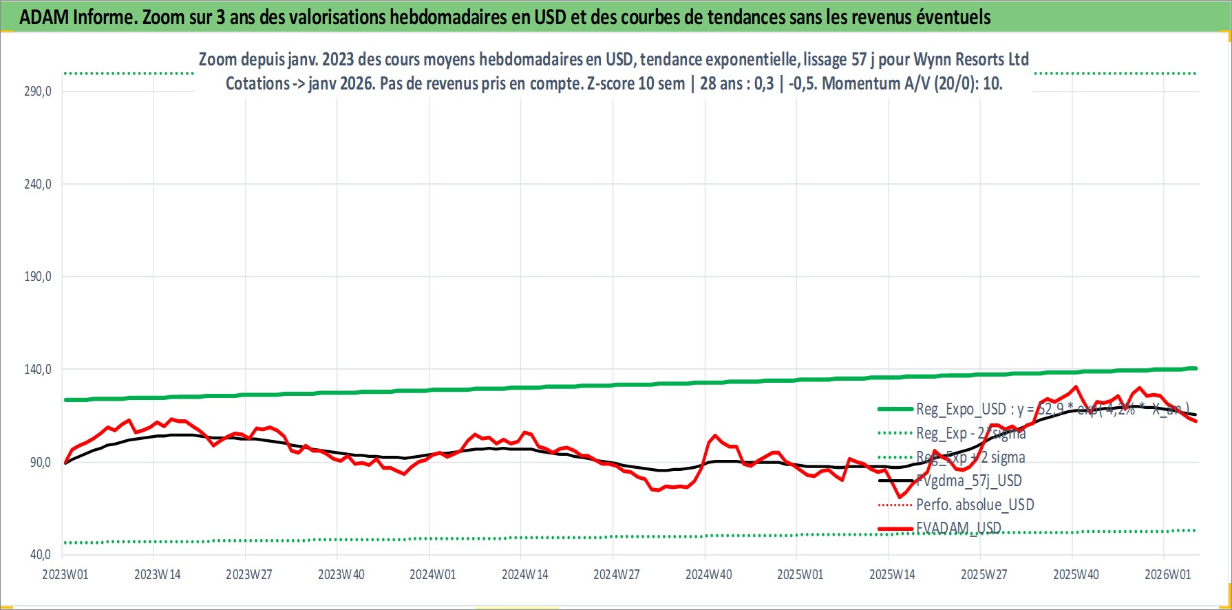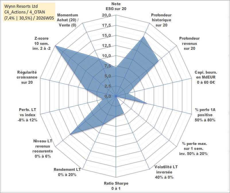Site dédié aux investisseursPage dédiée sur site financeAnalyse des valorisations hebdomadaires de l'action Wynn Resorts Ltd. Cet actif est cote en USD. Les valorisations sont en contrevaleur EURO et couvrent les semaines 2002W43 a 2026W05. Les revenus de cet actif financier sont pris en compte depuis la semaine 2006W47. La note globale ESG de cet actif est estimee a 7.0 (apres rebasage entre 0 et 20).