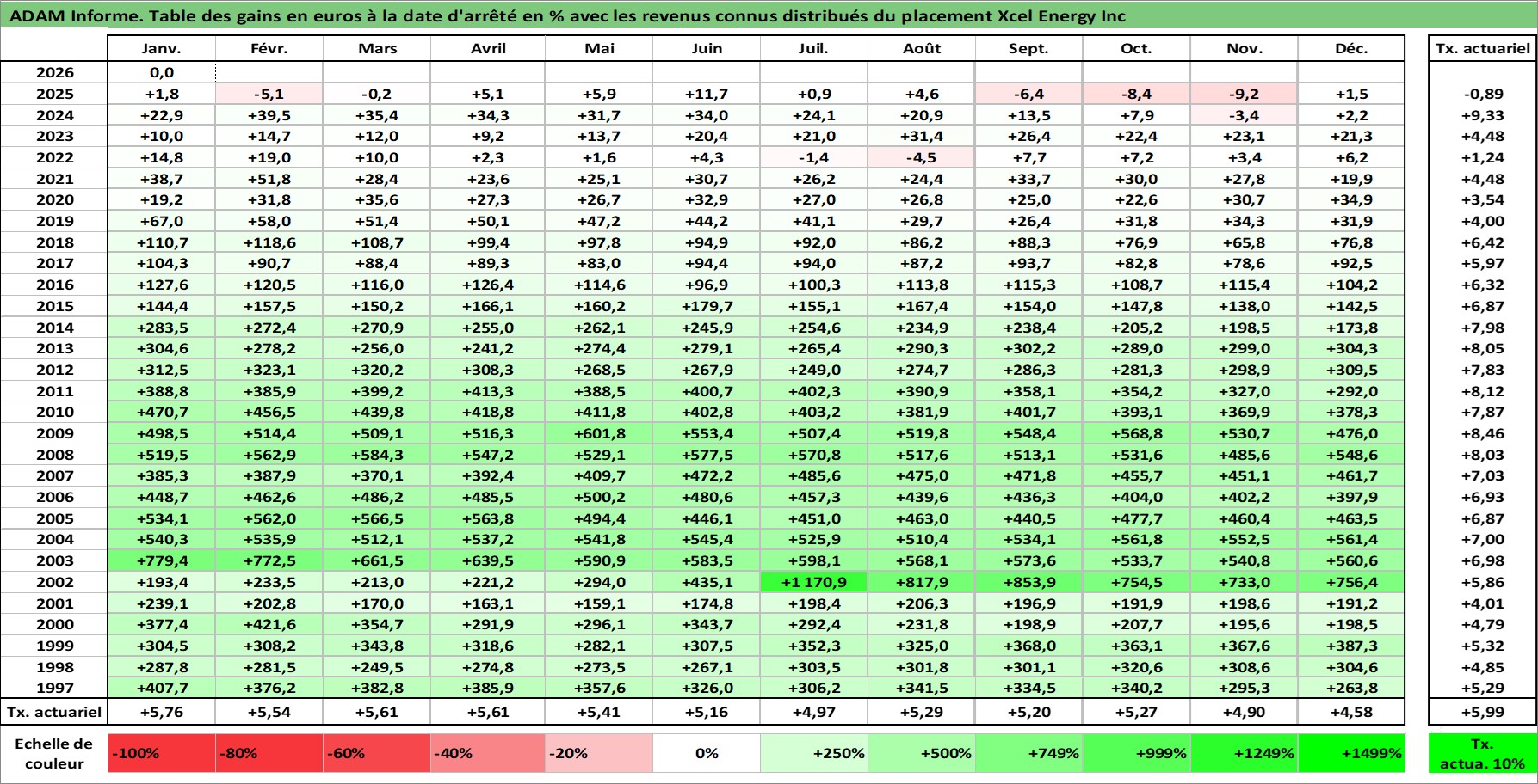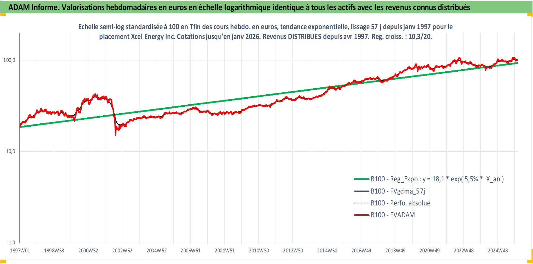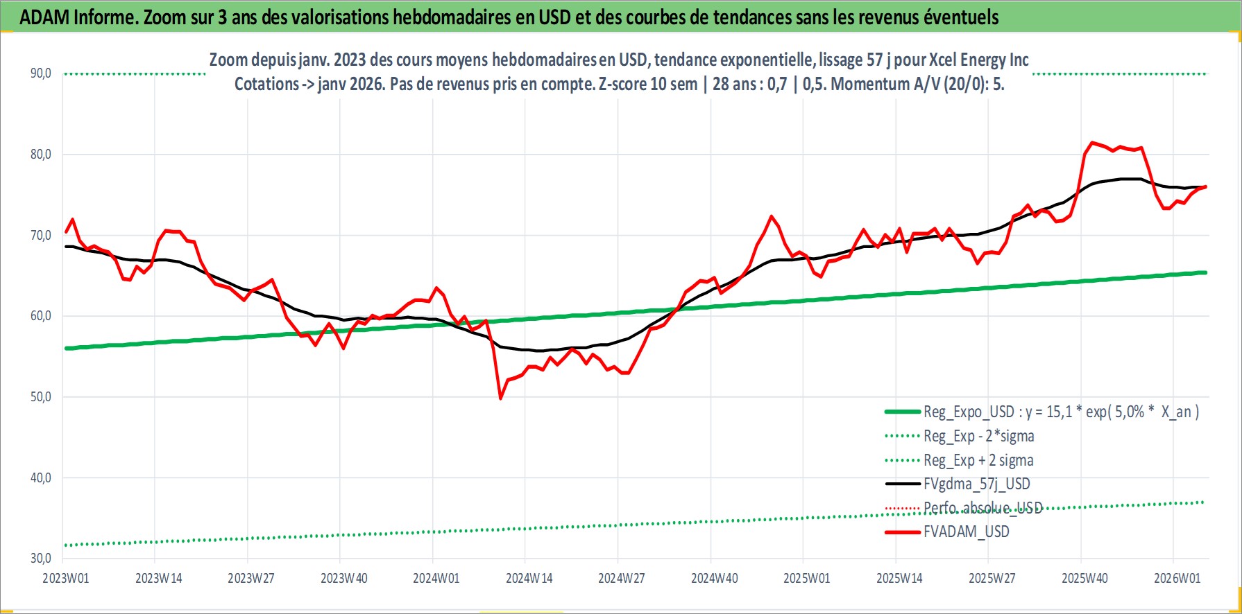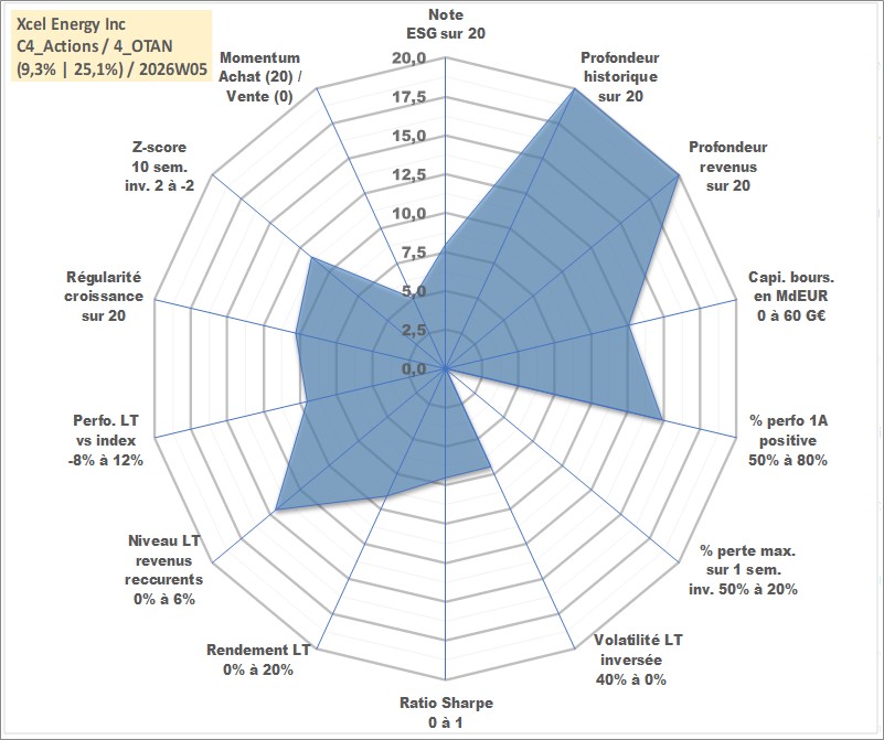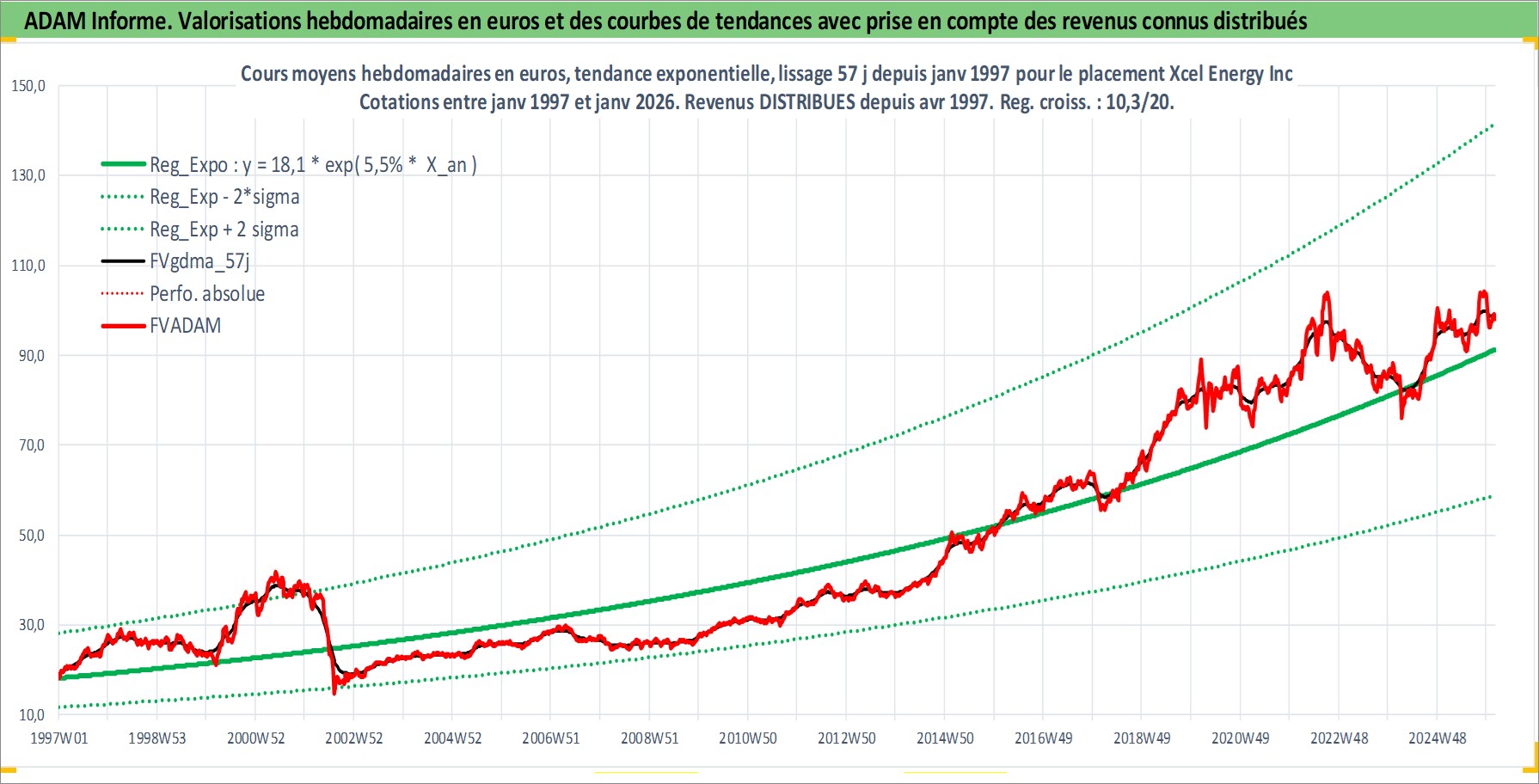 Site dédié aux investisseursPage dédiée sur site financeAnalyse des valorisations hebdomadaires de l'action Xcel Energy Inc. Cet actif est cote en USD. Les valorisations sont en contrevaleur EURO et couvrent les semaines 1997W01 a 2026W05. Les revenus de cet actif financier sont pris en compte depuis la semaine 1997W15. La note globale ESG de cet actif est estimee a 8.0 (apres rebasage entre 0 et 20).