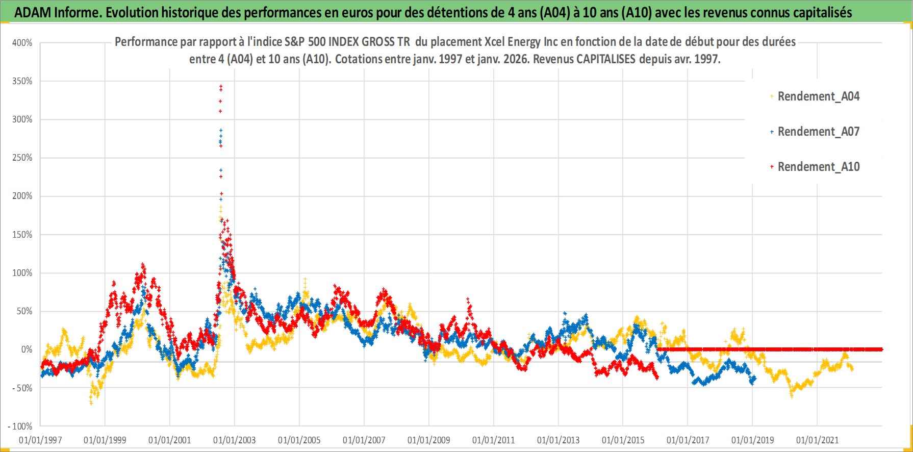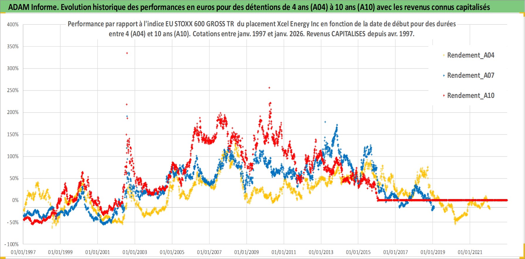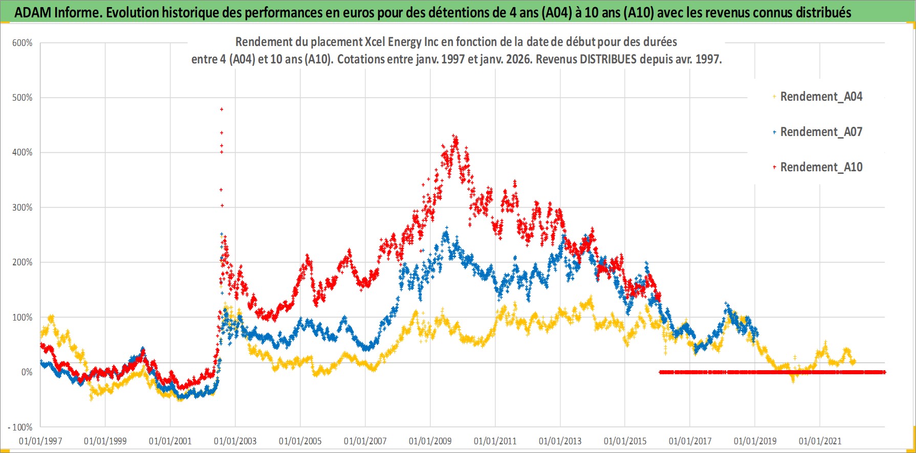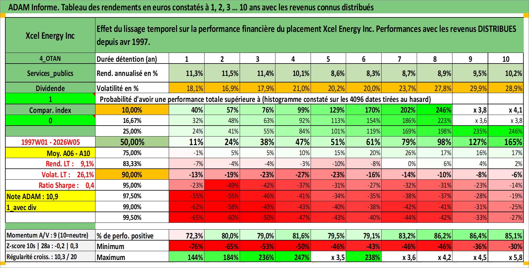 Site dédié aux investisseursPage dédiée sur site financeAnalyse des valorisations hebdomadaires de l'action Xcel Energy Inc. Cet actif est cote en USD. Les valorisations sont en contrevaleur EURO et couvrent les semaines 1997W01 a 2026W05. Les revenus de cet actif financier sont pris en compte depuis la semaine 1997W15. La note globale ESG de cet actif est estimee a 8.0 (apres rebasage entre 0 et 20).