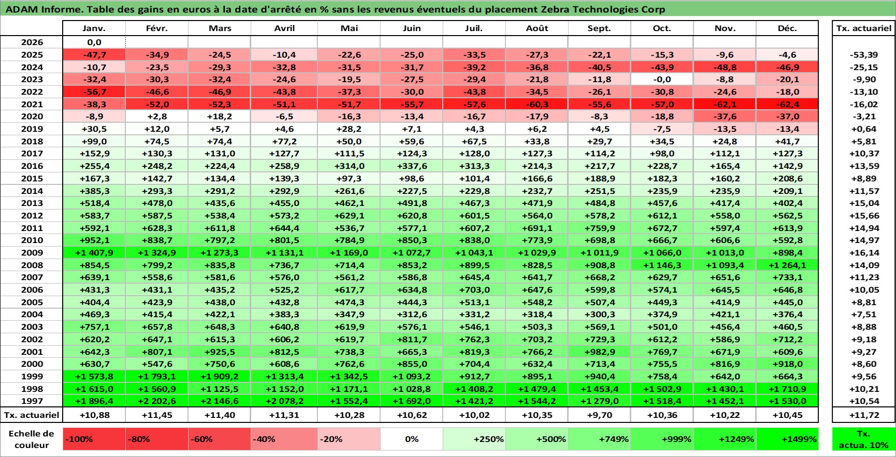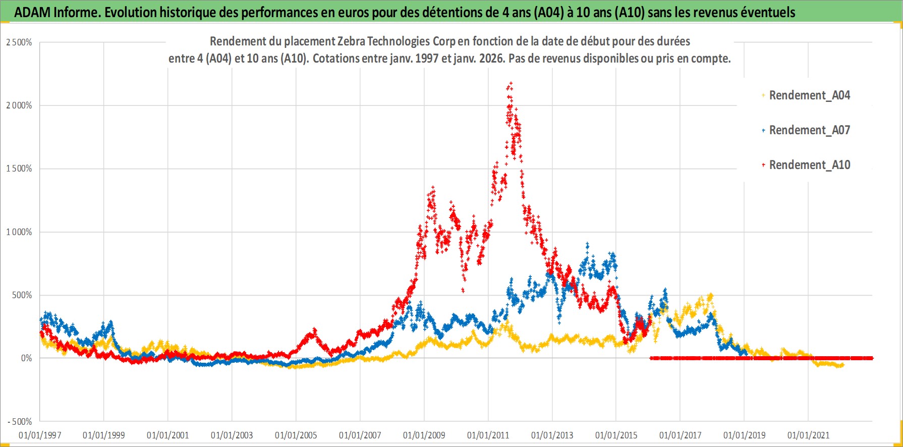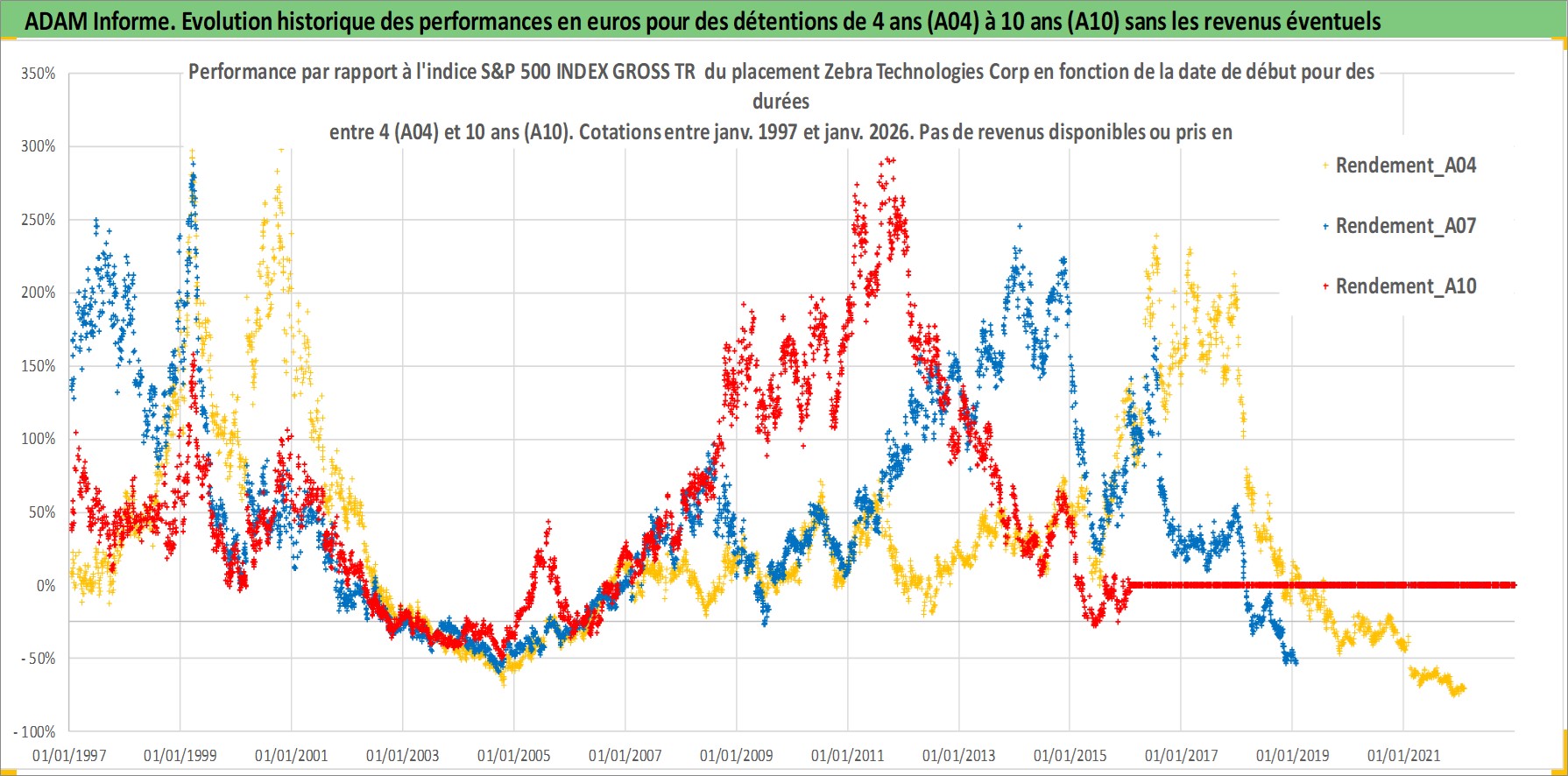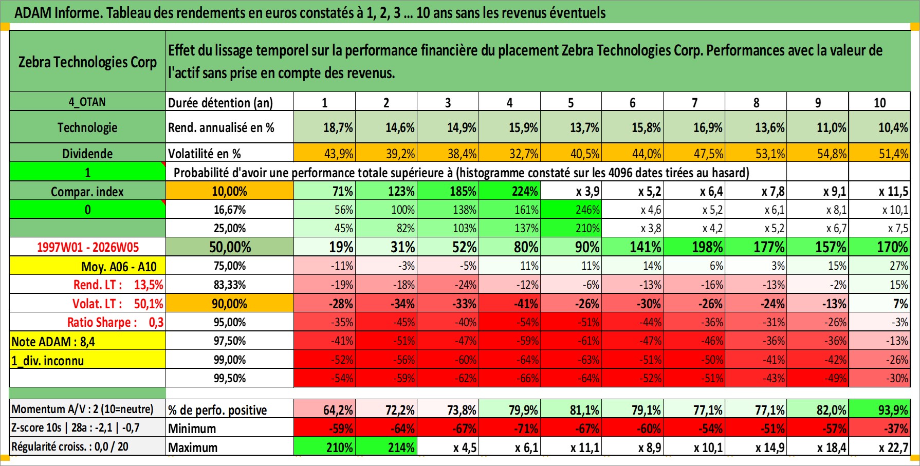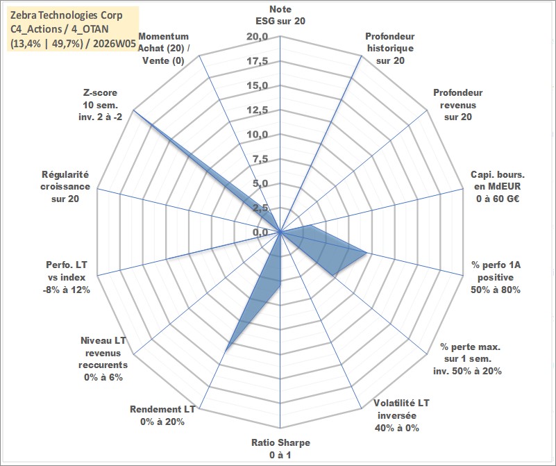 Site dédié aux investisseursPage dédiée sur site financeAnalyse des valorisations hebdomadaires de l'action Zebra Technologies Corp. Cet actif est cote en USD. Les valorisations sont en contrevaleur EURO et couvrent les semaines 1997W01 a 2026W05. Les revenus de cet actif financier ne sont pas connus car non existants ou non disponibles sur le site Yahoo Finance. La note ESG de cet actif n'est pas connue.