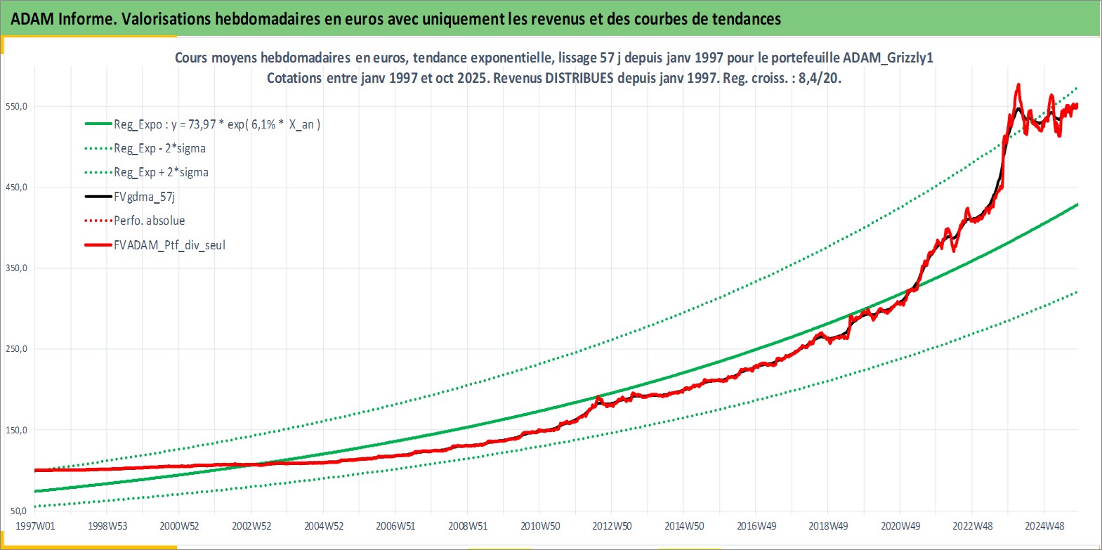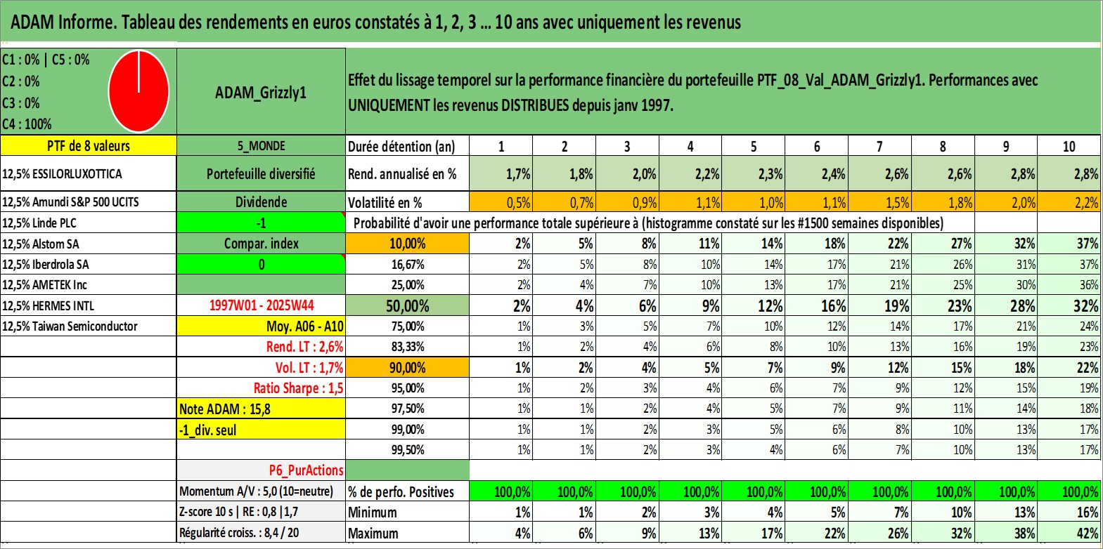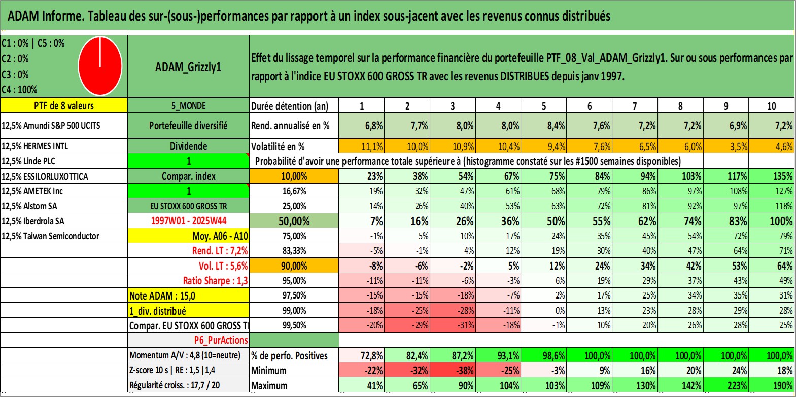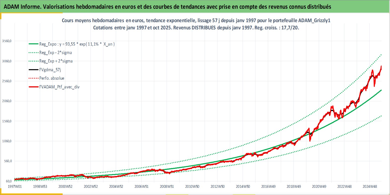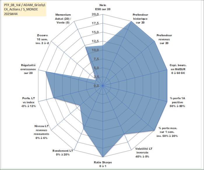 Site dédié aux investisseursPage dédiée sur site financeAnalyse des valorisations hebdomadaires du portefeuille ADAM_Grizzly1_8actifs avec un profil P6_PurActions. Ce portefeuille est cote en EUR. Les valorisations couvrent les semaines 1997W01 a 2025W44. Les revenus de cet actif financier sont pris en compte depuis la semaine 1997W01. La note globale ESG de cet actif est estimee a 11.2 (apres rebasage entre 0 et 20).