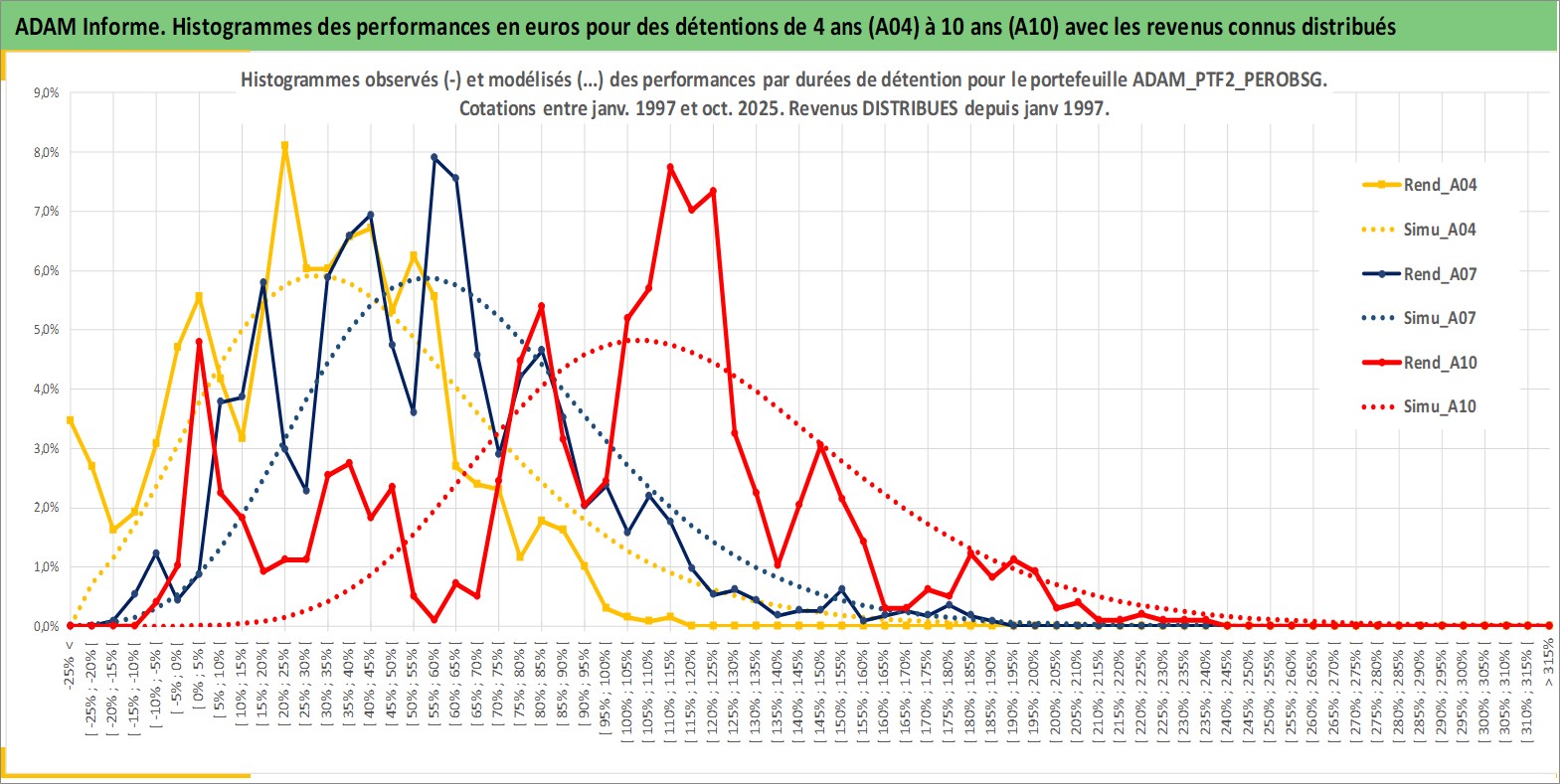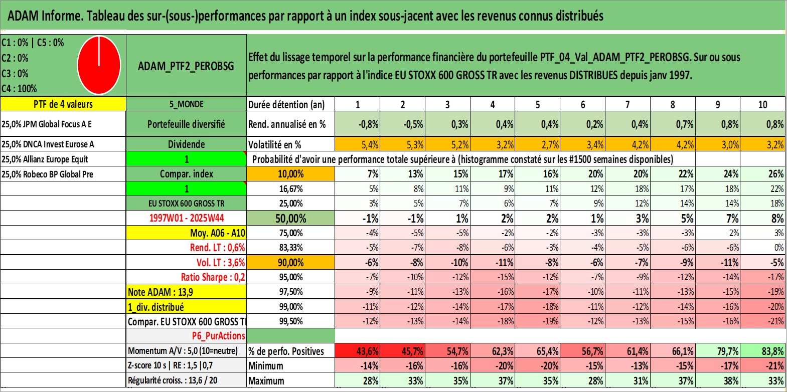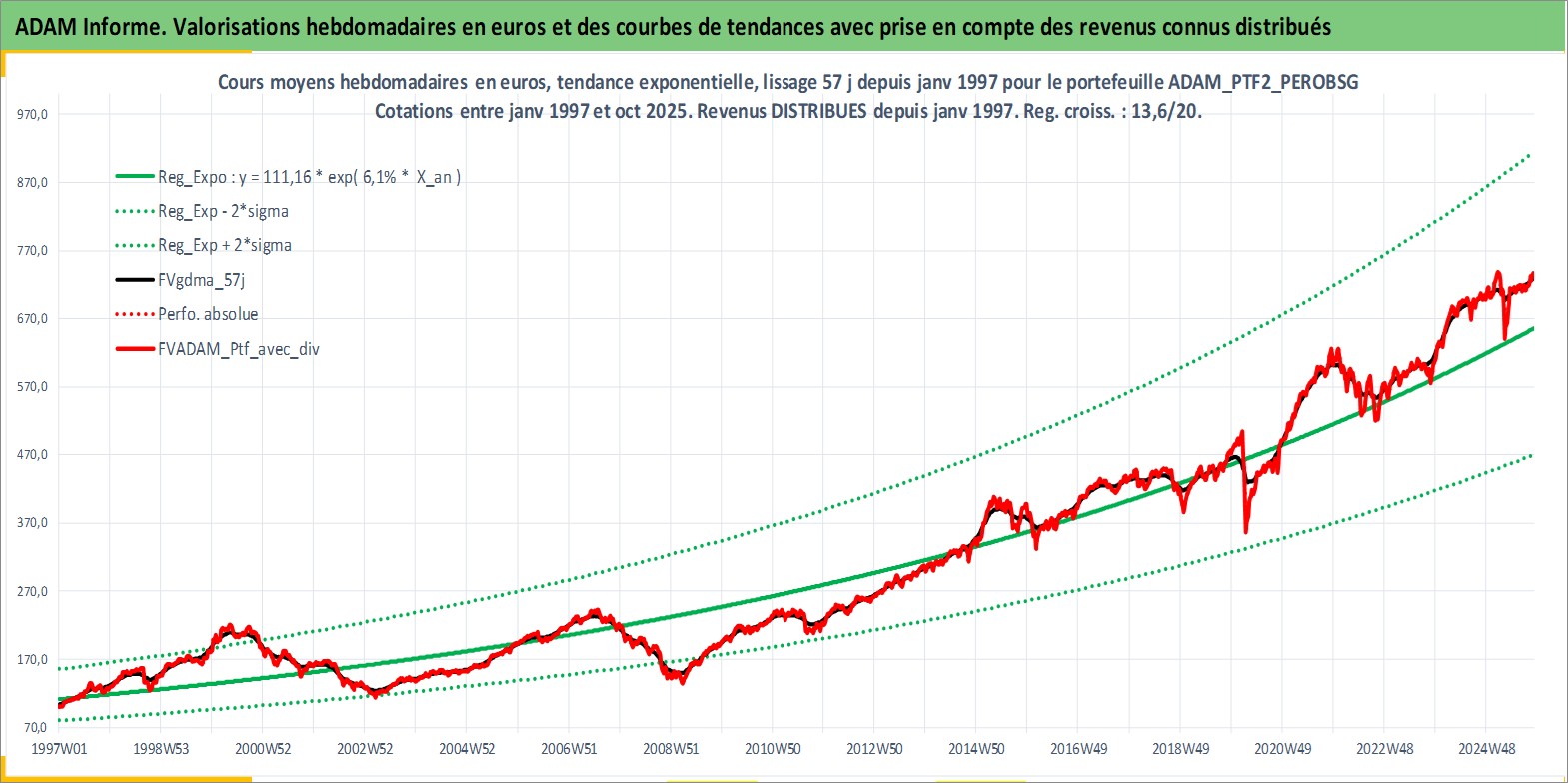 Site dédié aux investisseursPage dédiée sur site financeAnalyse des valorisations hebdomadaires du portefeuille PTF2_PEROBSG_4actifs avec un profil P6_PurActions. Ce portefeuille est cote en EUR. Les valorisations couvrent les semaines 1997W01 a 2025W44. Les revenus de cet actif financier sont pris en compte depuis la semaine 1997W01. La note globale ESG de cet actif est estimee a 9.0 (apres rebasage entre 0 et 20).