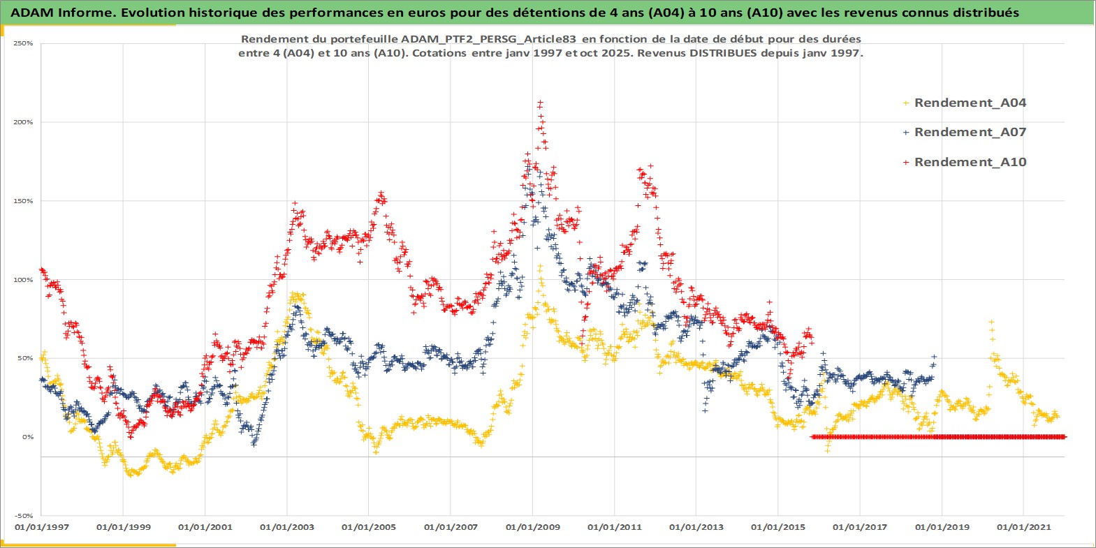 Site dédié aux investisseursPage dédiée sur site financeAnalyse des valorisations hebdomadaires du portefeuille PTF2_PERSG_Article83_4actifs avec un profil P6_PurActions. Ce portefeuille est cote en EUR. Les valorisations couvrent les semaines 1997W01 a 2025W44. Les revenus de cet actif financier sont pris en compte depuis la semaine 1997W01. La note globale ESG de cet actif est estimee a 9.2 (apres rebasage entre 0 et 20).