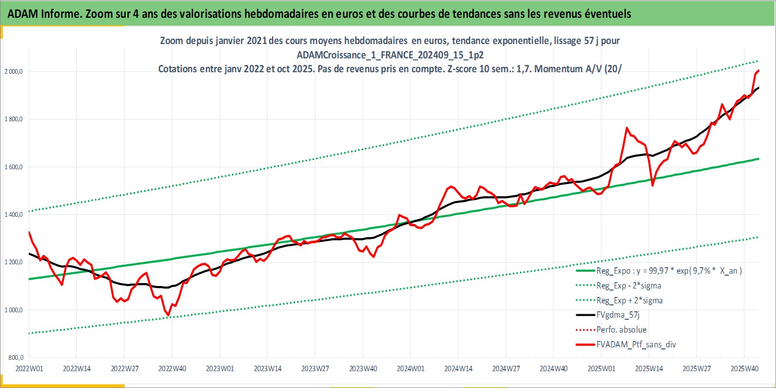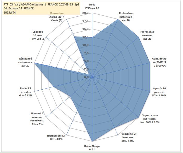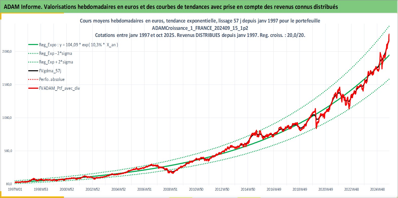 Site dédié aux investisseursPage dédiée sur site financeAnalyse des valorisations hebdomadaires du portefeuille ADAMCroissance_1_FRANCE_202409_15_1p2_3actifs avec un profil P6_PurActions. Ce portefeuille est cote en EUR. Les valorisations couvrent les semaines 1997W01 a 2025W44. Les revenus de cet actif financier sont pris en compte depuis la semaine 1997W01. La note globale ESG de cet actif est estimee a 12.3 (apres rebasage entre 0 et 20).