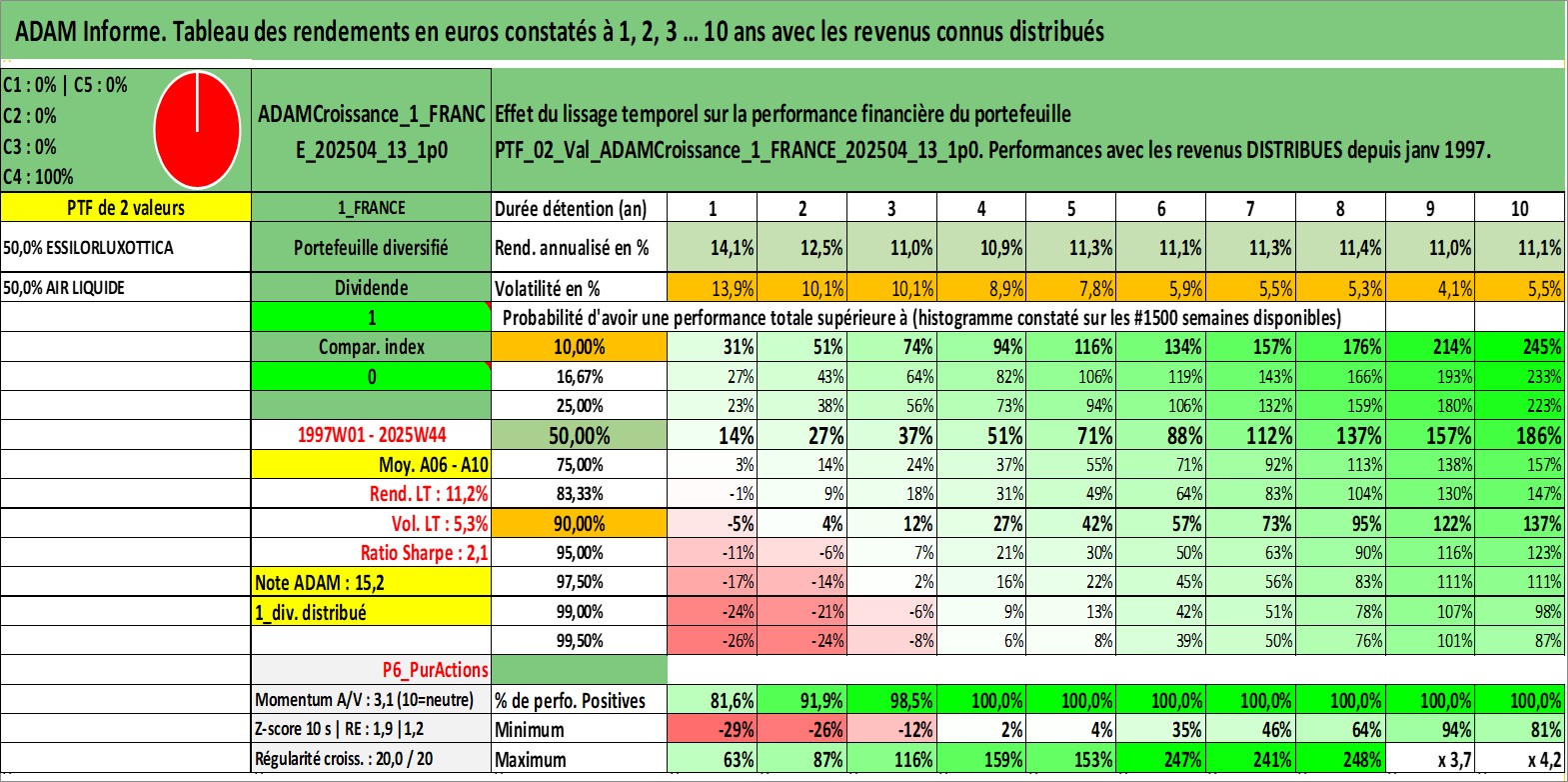Site dédié aux investisseursPage dédiée sur site financeAnalyse des valorisations hebdomadaires du portefeuille ADAMCroissance_1_FRANCE_202504_13_1p0_2actifs avec un profil P6_PurActions. Ce portefeuille est cote en EUR. Les valorisations couvrent les semaines 1997W01 a 2025W44. Les revenus de cet actif financier sont pris en compte depuis la semaine 1997W01. La note globale ESG de cet actif est estimee a 12.0 (apres rebasage entre 0 et 20).