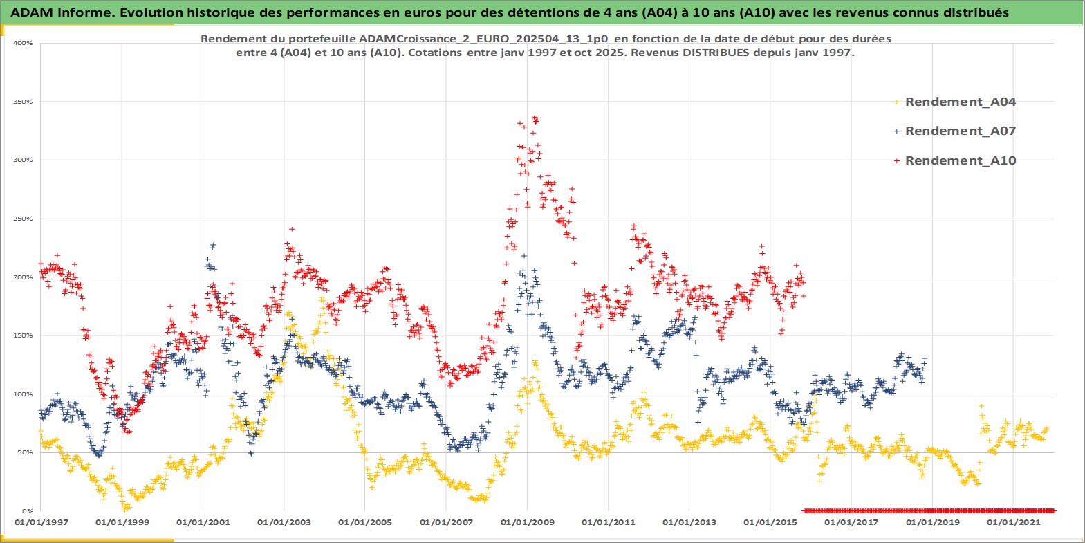 Site dédié aux investisseursPage dédiée sur site financeAnalyse des valorisations hebdomadaires du portefeuille ADAMCroissance_2_EURO_202504_13_1p0_7actifs avec un profil P6_PurActions. Ce portefeuille est cote en EUR. Les valorisations couvrent les semaines 1997W01 a 2025W44. Les revenus de cet actif financier sont pris en compte depuis la semaine 1997W01. La note globale ESG de cet actif est estimee a 12.7 (apres rebasage entre 0 et 20).
