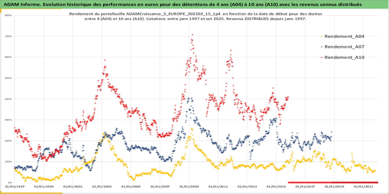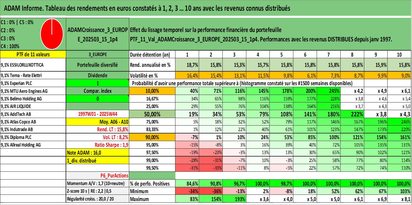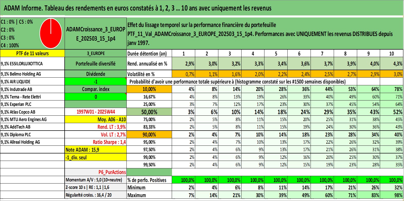 Site dédié aux investisseursPage dédiée sur site financeAnalyse des valorisations hebdomadaires du portefeuille ADAMCroissance_3_EUROPE_202503_15_1p4_11actifs avec un profil P6_PurActions. Ce portefeuille est cote en EUR. Les valorisations couvrent les semaines 1997W01 a 2025W44. Les revenus de cet actif financier sont pris en compte depuis la semaine 1997W01. La note globale ESG de cet actif est estimee a 12.5 (apres rebasage entre 0 et 20).