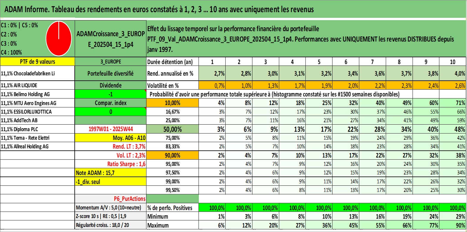 Site dédié aux investisseursPage dédiée sur site financeAnalyse des valorisations hebdomadaires du portefeuille ADAMCroissance_3_EUROPE_202504_15_1p4_9actifs avec un profil P6_PurActions. Ce portefeuille est cote en EUR. Les valorisations couvrent les semaines 1997W01 a 2025W44. Les revenus de cet actif financier sont pris en compte depuis la semaine 1997W01. La note globale ESG de cet actif est estimee a 12.0 (apres rebasage entre 0 et 20).