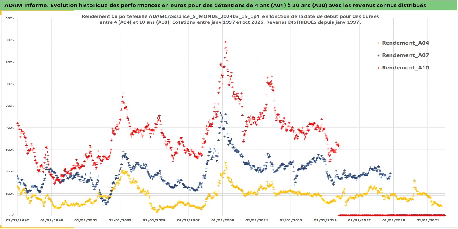 Site dédié aux investisseursPage dédiée sur site financeAnalyse des valorisations hebdomadaires du portefeuille ADAMCroissance_5_MONDE_202403_15_1p4_87actifs avec un profil P6_PurActions. Ce portefeuille est cote en EUR. Les valorisations couvrent les semaines 1997W01 a 2025W44. Les revenus de cet actif financier sont pris en compte depuis la semaine 1997W01. La note globale ESG de cet actif est estimee a 10.8 (apres rebasage entre 0 et 20).