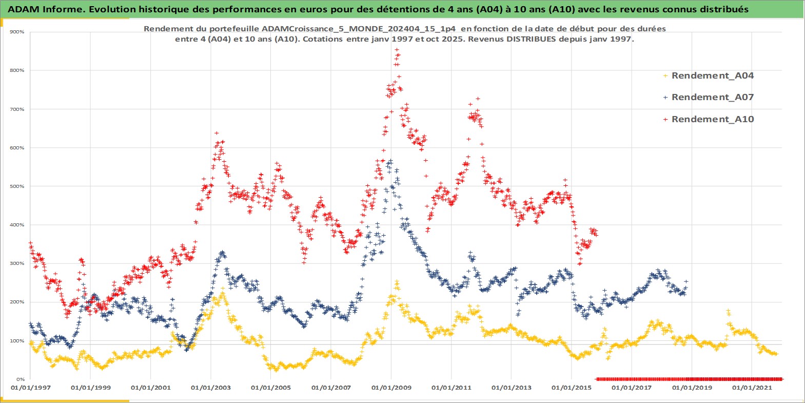 Site dédié aux investisseursPage dédiée sur site financeAnalyse des valorisations hebdomadaires du portefeuille ADAMCroissance_5_MONDE_202404_15_1p4_20actifs avec un profil P6_PurActions. Ce portefeuille est cote en EUR. Les valorisations couvrent les semaines 1997W01 a 2025W44. Les revenus de cet actif financier sont pris en compte depuis la semaine 1997W01. La note globale ESG de cet actif est estimee a 9.9 (apres rebasage entre 0 et 20).