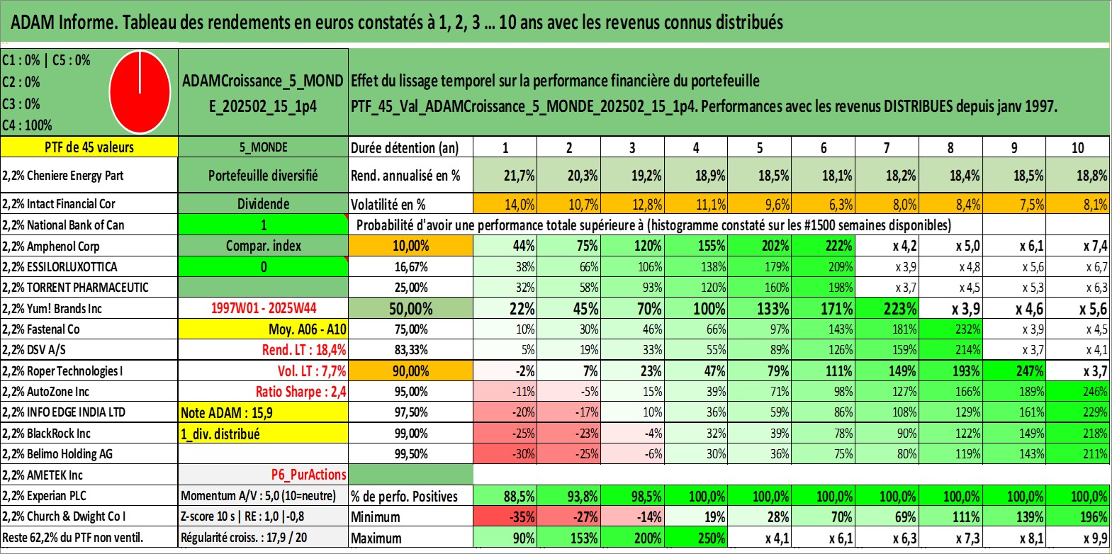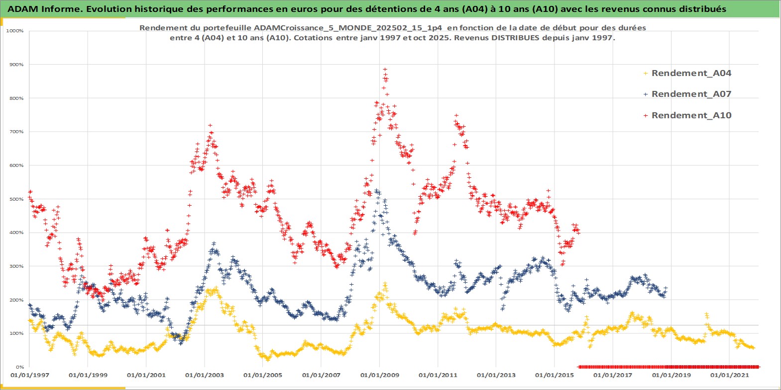 Site dédié aux investisseursPage dédiée sur site financeAnalyse des valorisations hebdomadaires du portefeuille ADAMCroissance_5_MONDE_202502_15_1p4_45actifs avec un profil P6_PurActions. Ce portefeuille est cote en EUR. Les valorisations couvrent les semaines 1997W01 a 2025W44. Les revenus de cet actif financier sont pris en compte depuis la semaine 1997W01. La note globale ESG de cet actif est estimee a 10.8 (apres rebasage entre 0 et 20).