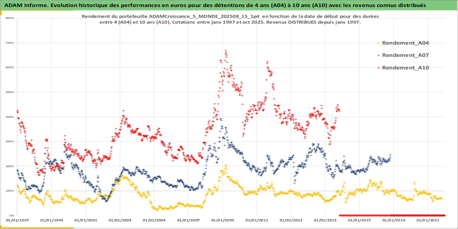 Site dédié aux investisseursPage dédiée sur site financeAnalyse des valorisations hebdomadaires du portefeuille ADAMCroissance_5_MONDE_202508_15_1p4_26actifs avec un profil P6_PurActions. Ce portefeuille est cote en EUR. Les valorisations couvrent les semaines 1997W01 a 2025W44. Les revenus de cet actif financier sont pris en compte depuis la semaine 1997W01. La note globale ESG de cet actif est estimee a 11.9 (apres rebasage entre 0 et 20).