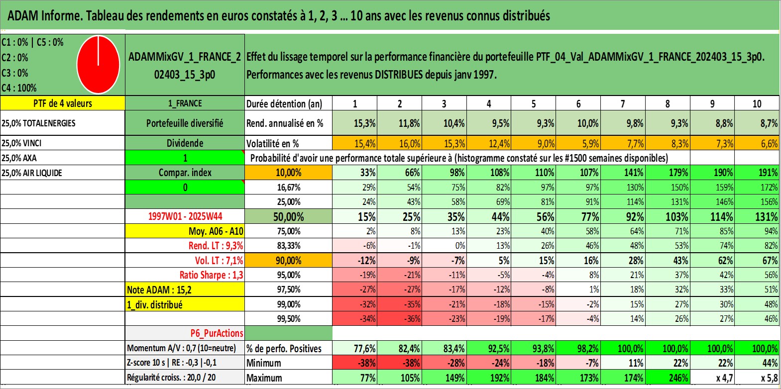 Site dédié aux investisseursPage dédiée sur site financeAnalyse des valorisations hebdomadaires du portefeuille ADAMMixGV_1_FRANCE_202403_15_3p0_4actifs avec un profil P6_PurActions. Ce portefeuille est cote en EUR. Les valorisations couvrent les semaines 1997W01 a 2025W44. Les revenus de cet actif financier sont pris en compte depuis la semaine 1997W01. La note globale ESG de cet actif est estimee a 9.5 (apres rebasage entre 0 et 20).