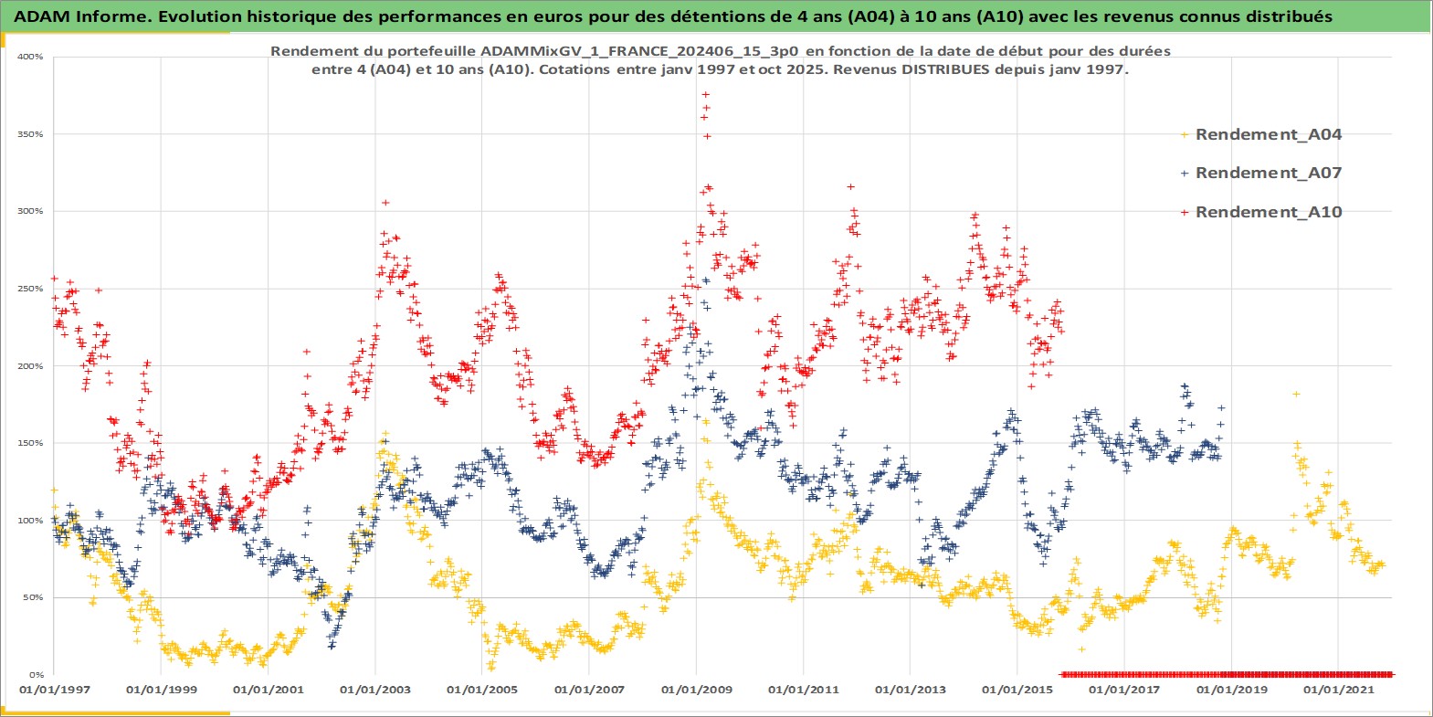 Site dédié aux investisseursPage dédiée sur site financeAnalyse des valorisations hebdomadaires du portefeuille ADAMMixGV_1_FRANCE_202406_15_3p0_6actifs avec un profil P6_PurActions. Ce portefeuille est cote en EUR. Les valorisations couvrent les semaines 1997W01 a 2025W44. Les revenus de cet actif financier sont pris en compte depuis la semaine 1997W01. La note globale ESG de cet actif est estimee a 11.8 (apres rebasage entre 0 et 20).