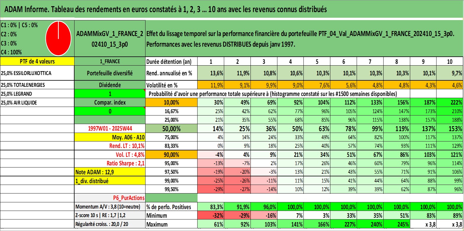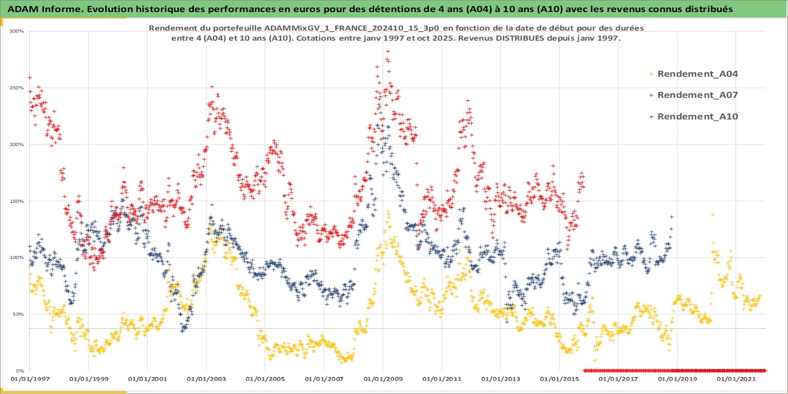 Site dédié aux investisseursPage dédiée sur site financeAnalyse des valorisations hebdomadaires du portefeuille ADAMMixGV_1_FRANCE_202410_15_3p0_4actifs avec un profil P6_PurActions. Ce portefeuille est cote en EUR. Les valorisations couvrent les semaines 1997W01 a 2025W44. Les revenus de cet actif financier sont pris en compte depuis la semaine 1997W01. La note globale ESG de cet actif est estimee a 10.5 (apres rebasage entre 0 et 20).