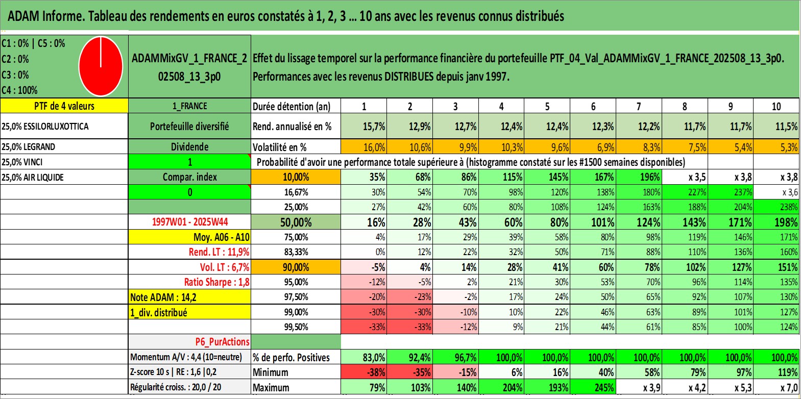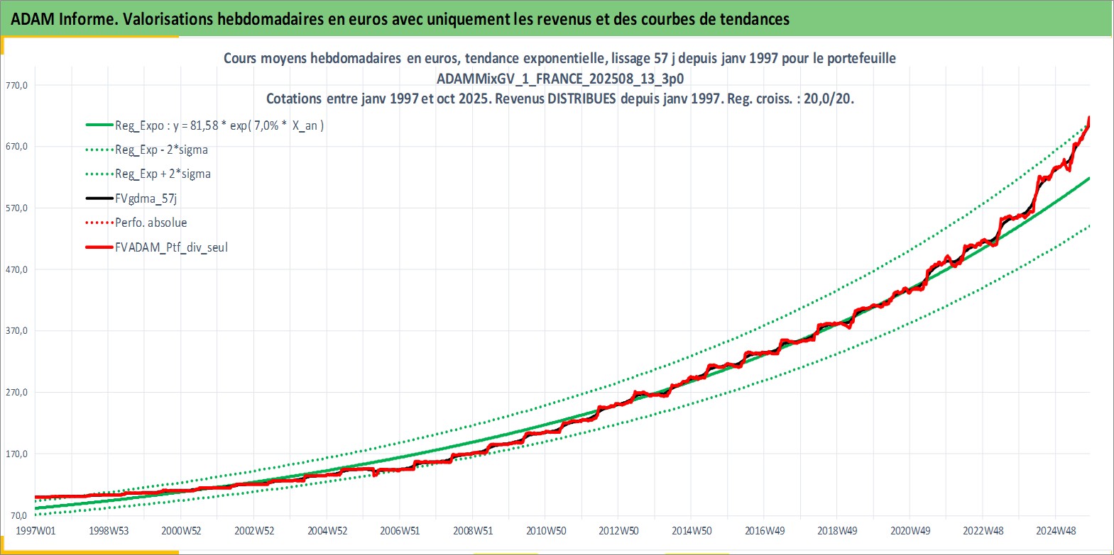 Site dédié aux investisseursPage dédiée sur site financeAnalyse des valorisations hebdomadaires du portefeuille ADAMMixGV_1_FRANCE_202508_13_3p0_4actifs avec un profil P6_PurActions. Ce portefeuille est cote en EUR. Les valorisations couvrent les semaines 1997W01 a 2025W44. Les revenus de cet actif financier sont pris en compte depuis la semaine 1997W01. La note globale ESG de cet actif est estimee a 11.0 (apres rebasage entre 0 et 20).