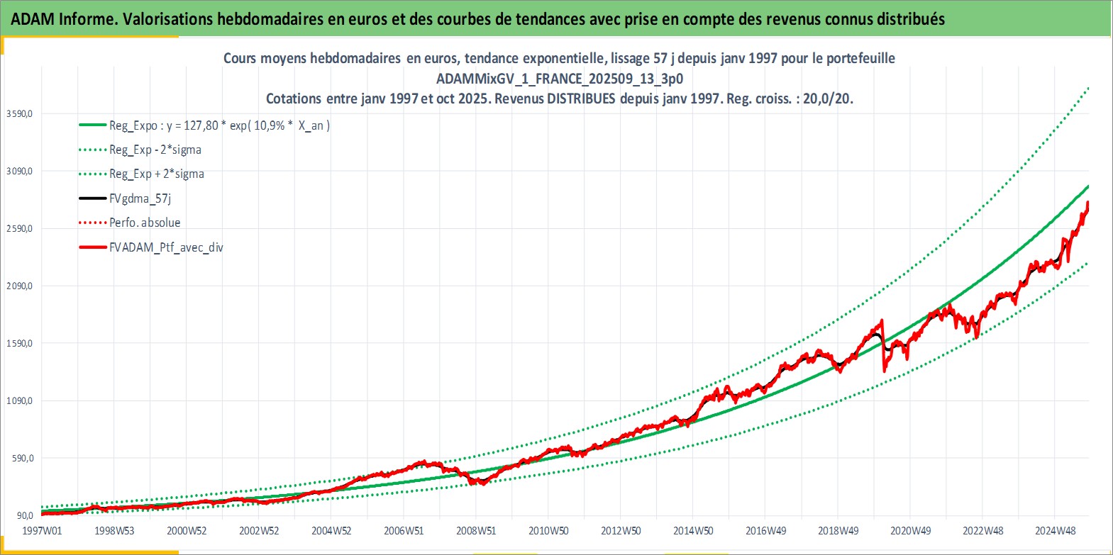 Site dédié aux investisseursPage dédiée sur site financeAnalyse des valorisations hebdomadaires du portefeuille ADAMMixGV_1_FRANCE_202509_13_3p0_5actifs avec un profil P6_PurActions. Ce portefeuille est cote en EUR. Les valorisations couvrent les semaines 1997W01 a 2025W44. Les revenus de cet actif financier sont pris en compte depuis la semaine 1997W01. La note globale ESG de cet actif est estimee a 11.0 (apres rebasage entre 0 et 20).