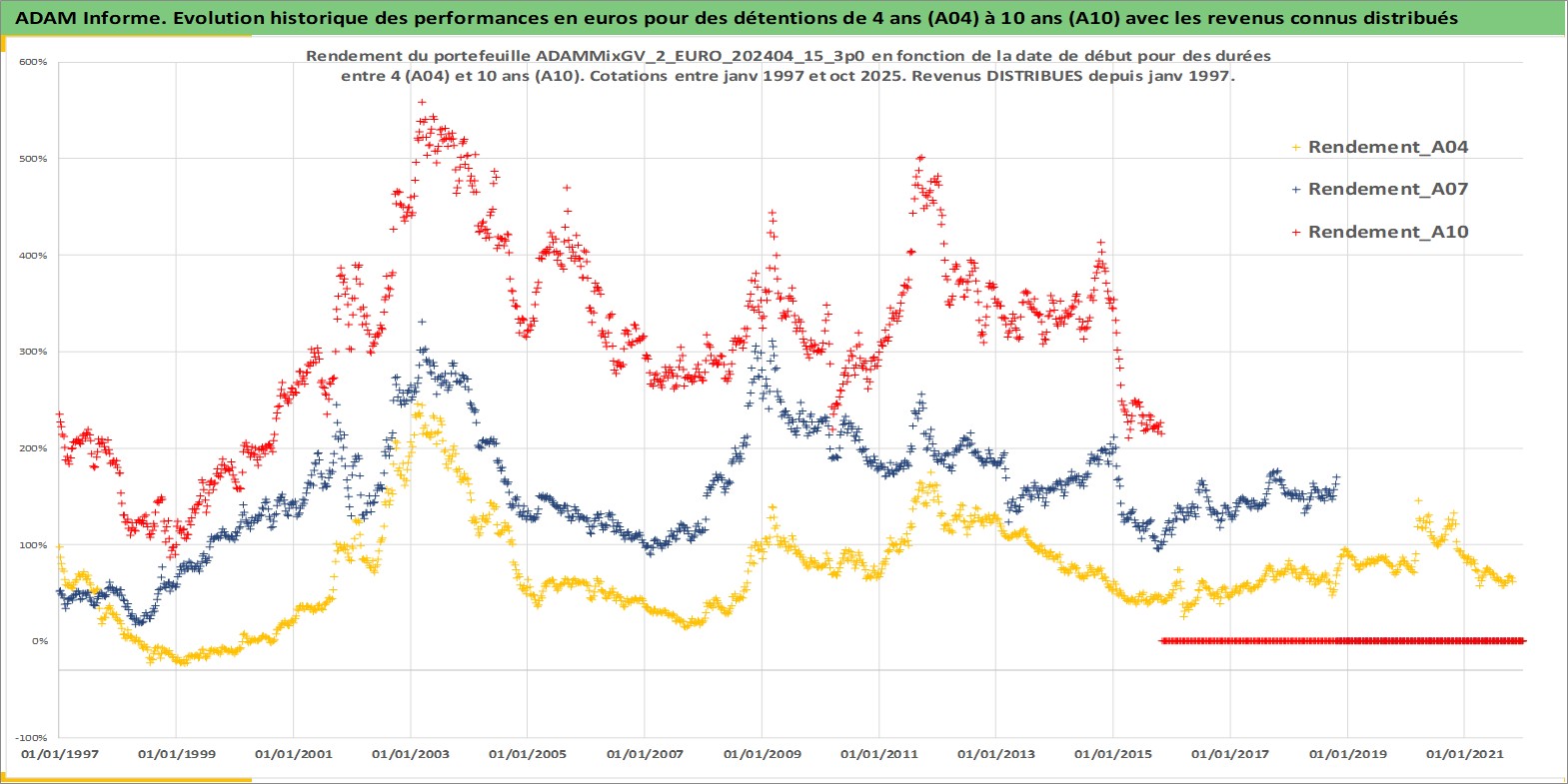 Site dédié aux investisseursPage dédiée sur site financeAnalyse des valorisations hebdomadaires du portefeuille ADAMMixGV_2_EURO_202404_15_3p0_5actifs avec un profil P6_PurActions. Ce portefeuille est cote en EUR. Les valorisations couvrent les semaines 1997W01 a 2025W44. Les revenus de cet actif financier sont pris en compte depuis la semaine 1997W01. La note globale ESG de cet actif est estimee a 14.2 (apres rebasage entre 0 et 20).