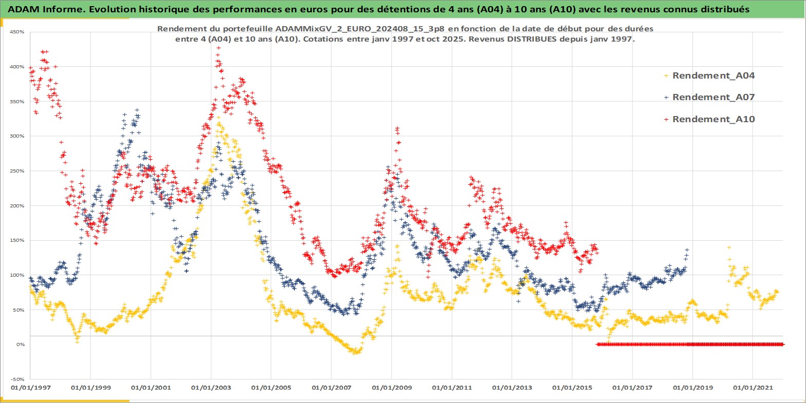 Site dédié aux investisseursPage dédiée sur site financeAnalyse des valorisations hebdomadaires du portefeuille ADAMMixGV_2_EURO_202408_15_3p8_11actifs avec un profil P6_PurActions. Ce portefeuille est cote en EUR. Les valorisations couvrent les semaines 1997W01 a 2025W44. Les revenus de cet actif financier sont pris en compte depuis la semaine 1997W01. La note globale ESG de cet actif est estimee a 10.9 (apres rebasage entre 0 et 20).