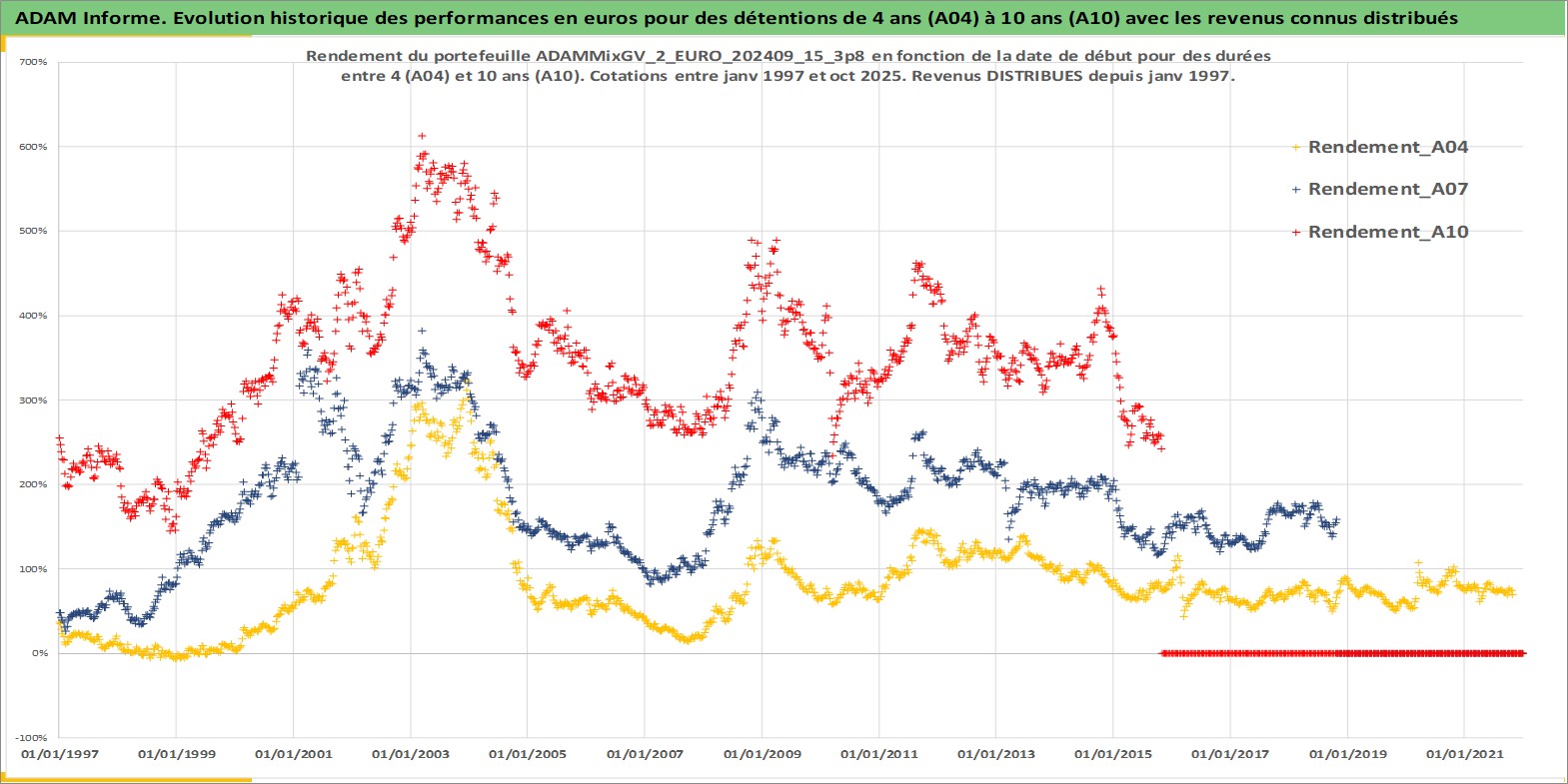 Site dédié aux investisseursPage dédiée sur site financeAnalyse des valorisations hebdomadaires du portefeuille ADAMMixGV_2_EURO_202409_15_3p8_6actifs avec un profil P6_PurActions. Ce portefeuille est cote en EUR. Les valorisations couvrent les semaines 1997W01 a 2025W44. Les revenus de cet actif financier sont pris en compte depuis la semaine 1997W01. La note globale ESG de cet actif est estimee a 12.4 (apres rebasage entre 0 et 20).