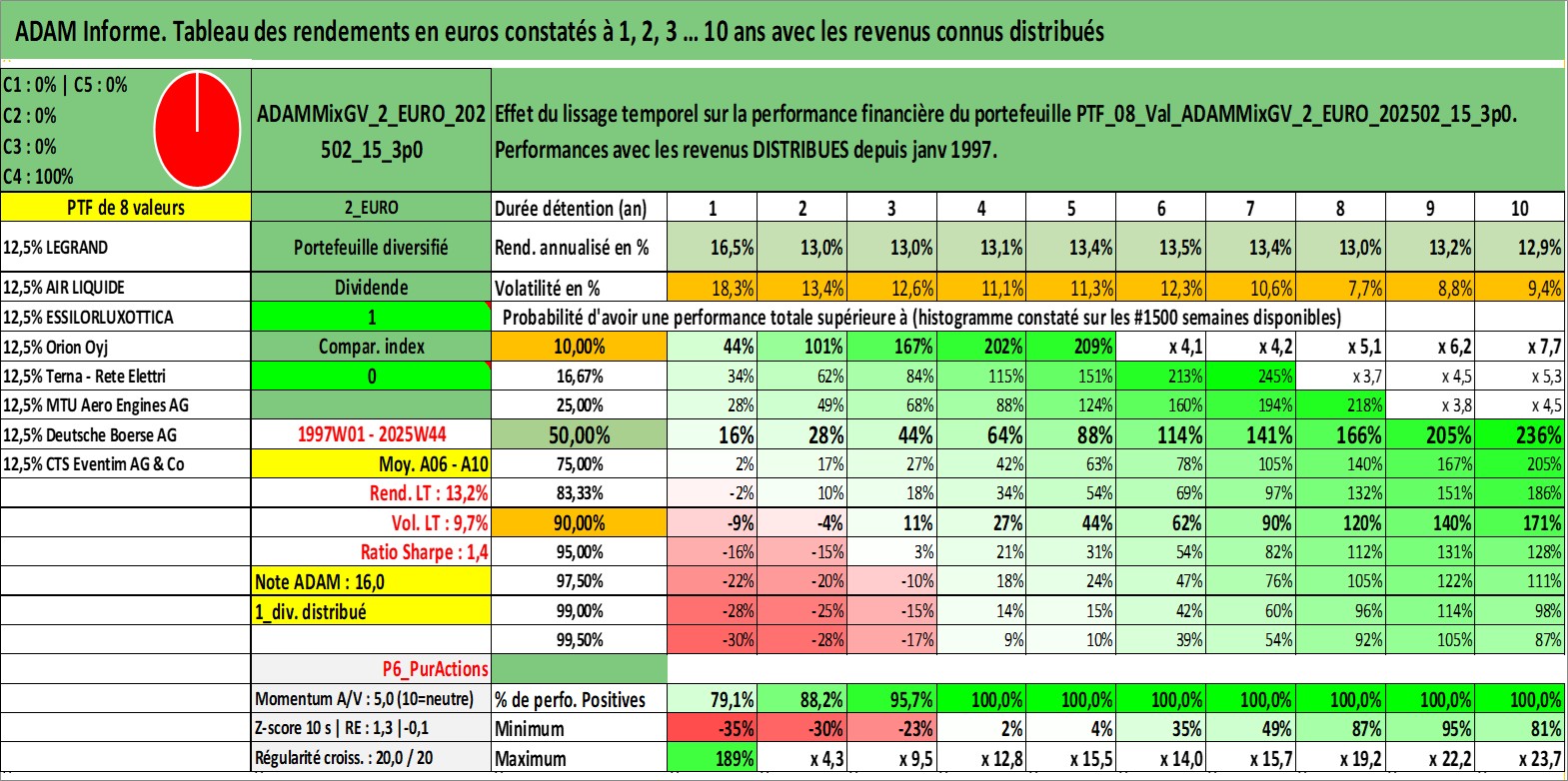 Site dédié aux investisseursPage dédiée sur site financeAnalyse des valorisations hebdomadaires du portefeuille ADAMMixGV_2_EURO_202502_15_3p0_8actifs avec un profil P6_PurActions. Ce portefeuille est cote en EUR. Les valorisations couvrent les semaines 1997W01 a 2025W44. Les revenus de cet actif financier sont pris en compte depuis la semaine 1997W01. La note globale ESG de cet actif est estimee a 12.1 (apres rebasage entre 0 et 20).