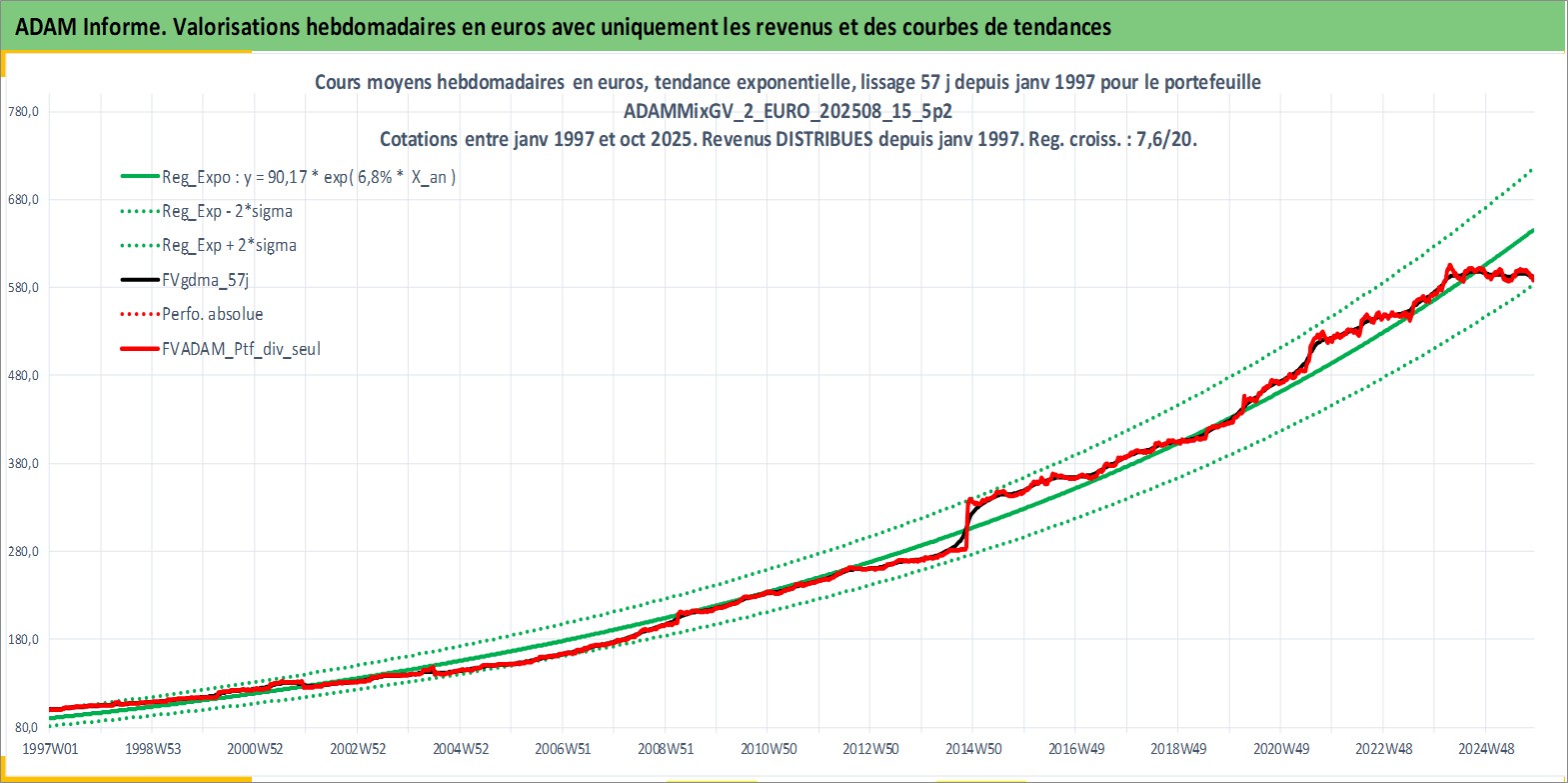 Site dédié aux investisseursPage dédiée sur site financeAnalyse des valorisations hebdomadaires du portefeuille ADAMMixGV_2_EURO_202508_15_5p2_6actifs avec un profil P6_PurActions. Ce portefeuille est cote en EUR. Les valorisations couvrent les semaines 1997W01 a 2025W44. Les revenus de cet actif financier sont pris en compte depuis la semaine 1997W01. La note globale ESG de cet actif est estimee a 14.3 (apres rebasage entre 0 et 20).