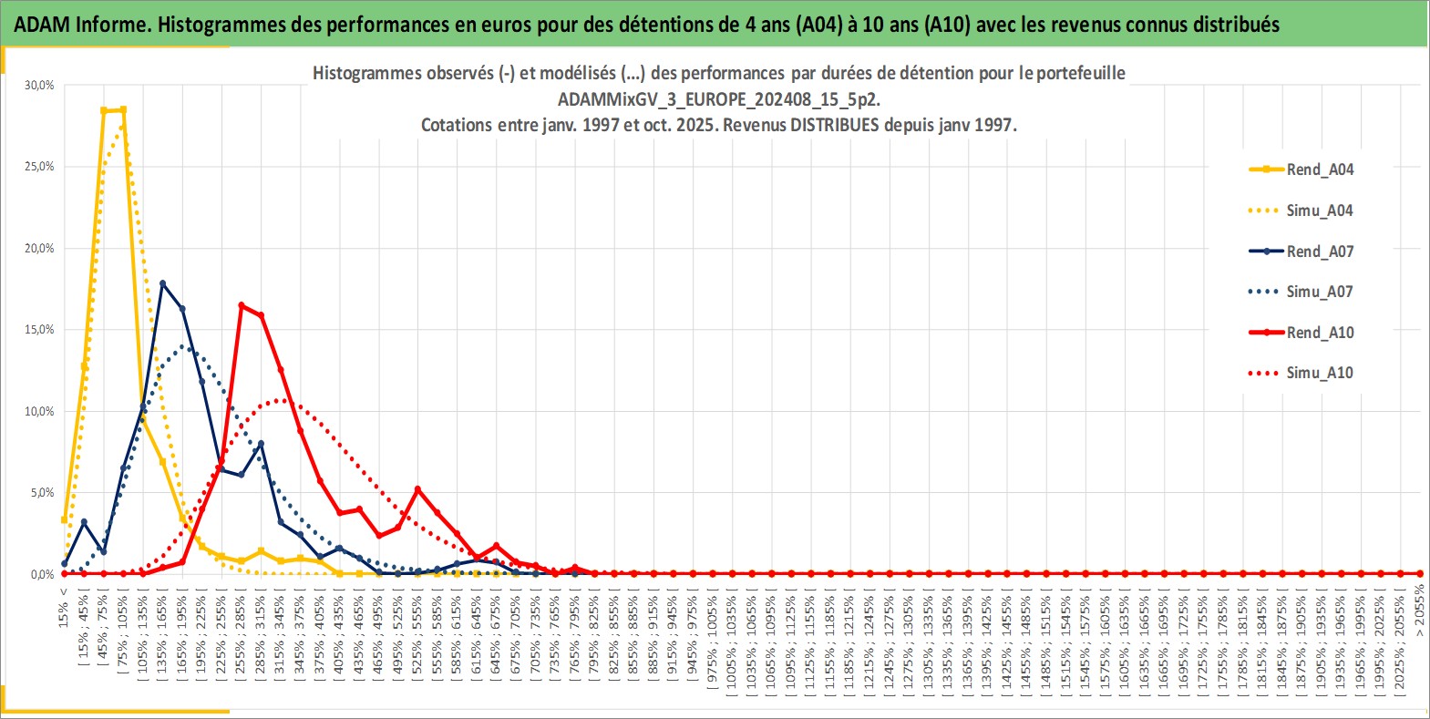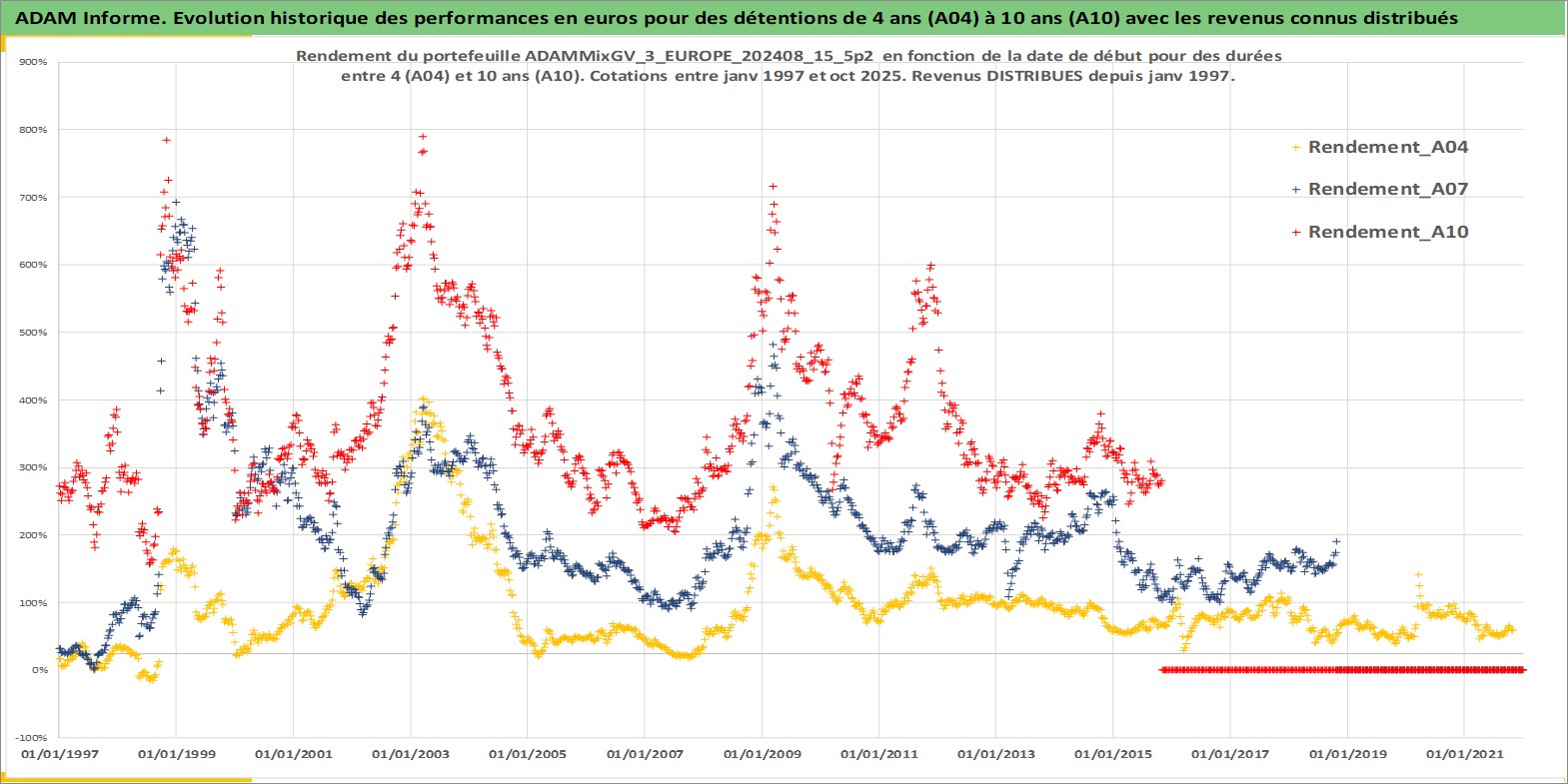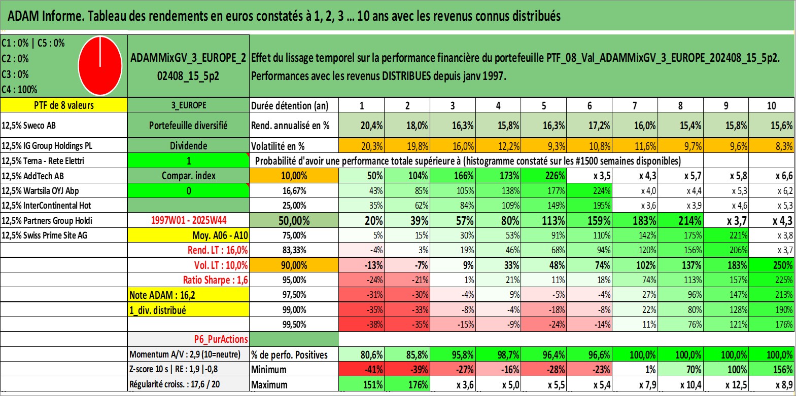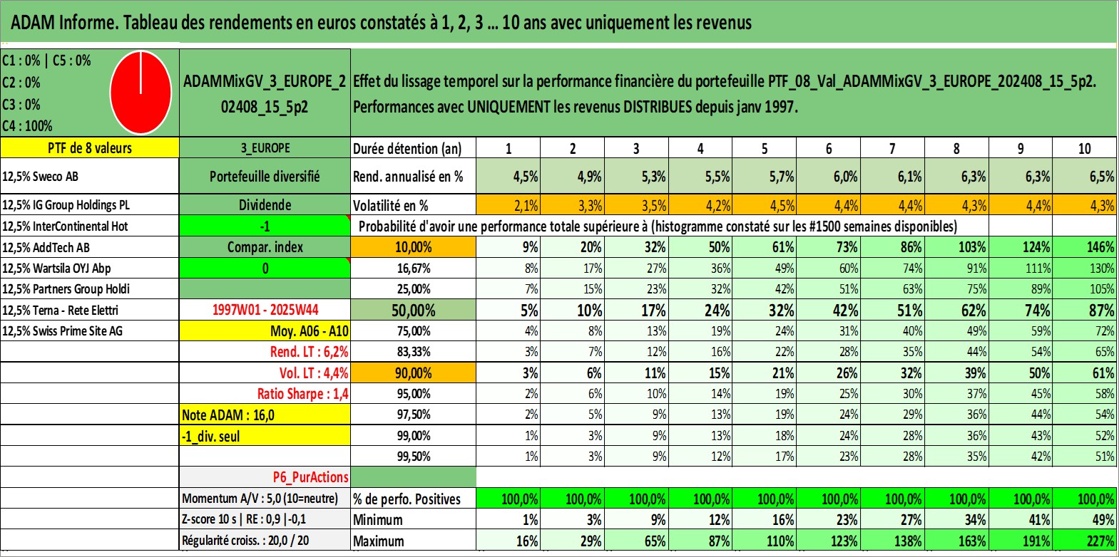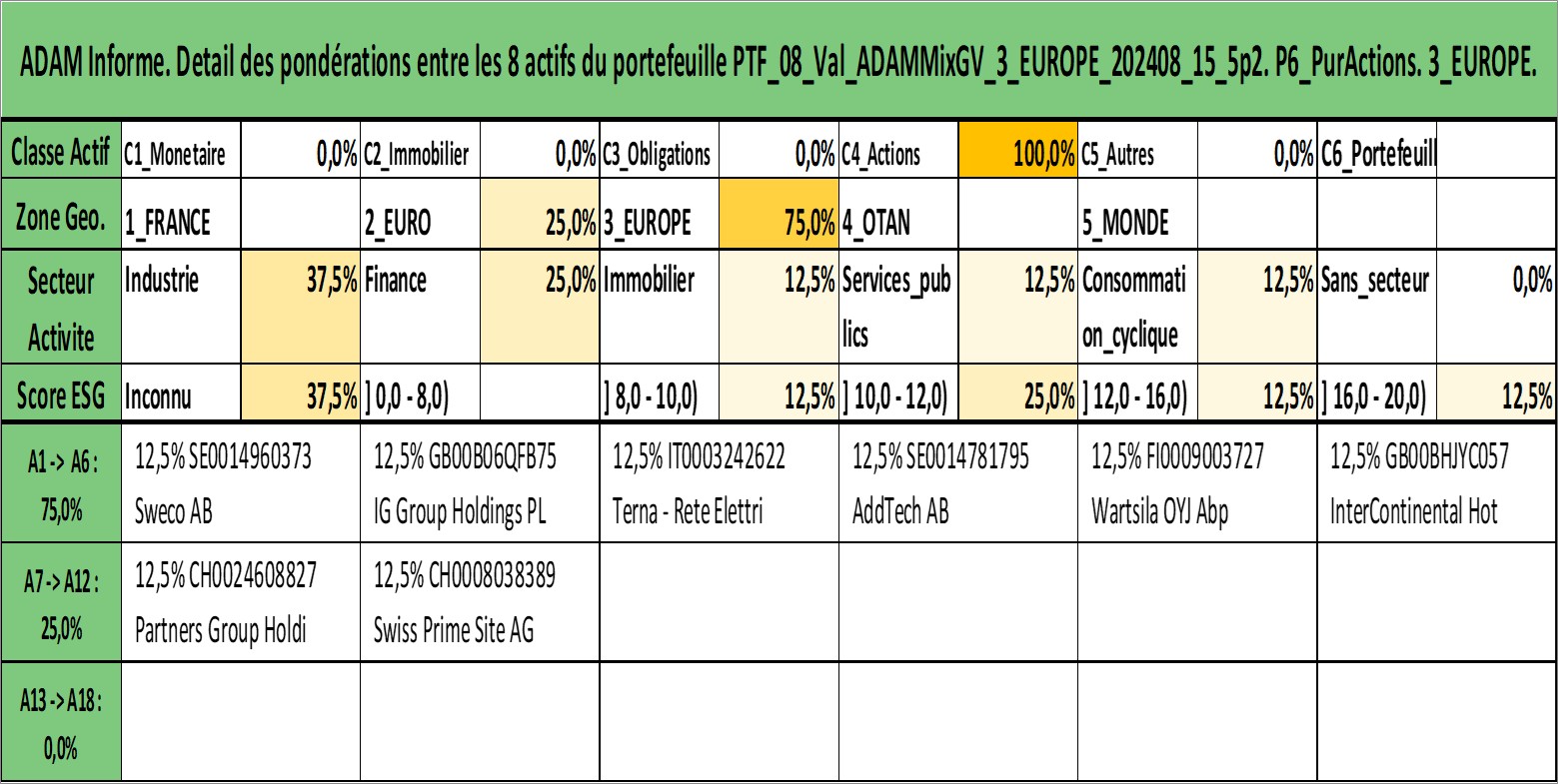 Site dédié aux investisseursPage dédiée sur site financeAnalyse des valorisations hebdomadaires du portefeuille ADAMMixGV_3_EUROPE_202408_15_5p2_8actifs avec un profil P6_PurActions. Ce portefeuille est cote en EUR. Les valorisations couvrent les semaines 1997W01 a 2025W44. Les revenus de cet actif financier sont pris en compte depuis la semaine 1997W01. La note globale ESG de cet actif est estimee a 13.0 (apres rebasage entre 0 et 20).