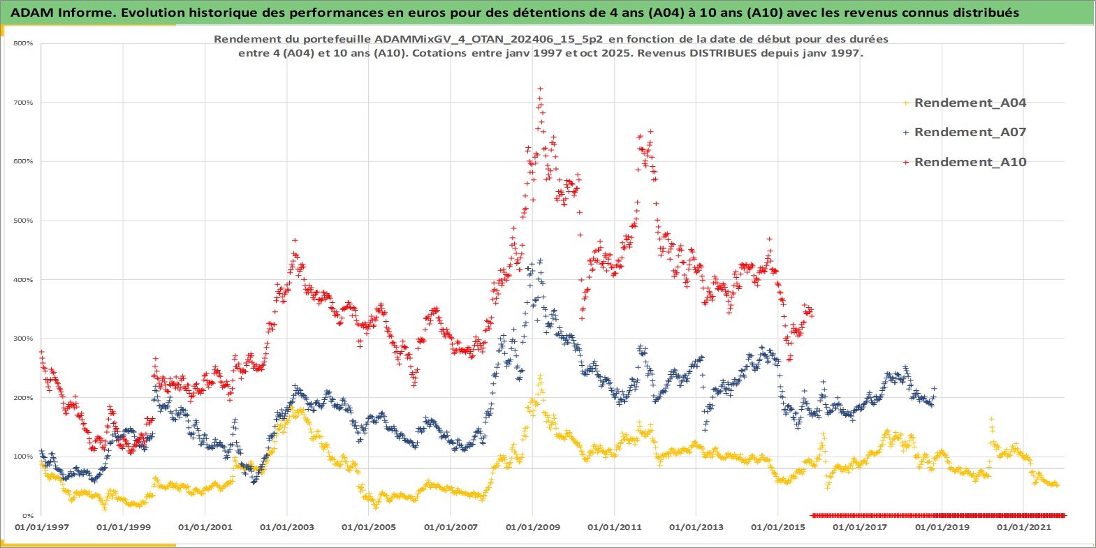 Site dédié aux investisseursPage dédiée sur site financeAnalyse des valorisations hebdomadaires du portefeuille ADAMMixGV_4_OTAN_202406_15_5p2_27actifs avec un profil P6_PurActions. Ce portefeuille est cote en EUR. Les valorisations couvrent les semaines 1997W01 a 2025W44. Les revenus de cet actif financier sont pris en compte depuis la semaine 1997W01. La note globale ESG de cet actif est estimee a 11.3 (apres rebasage entre 0 et 20).
