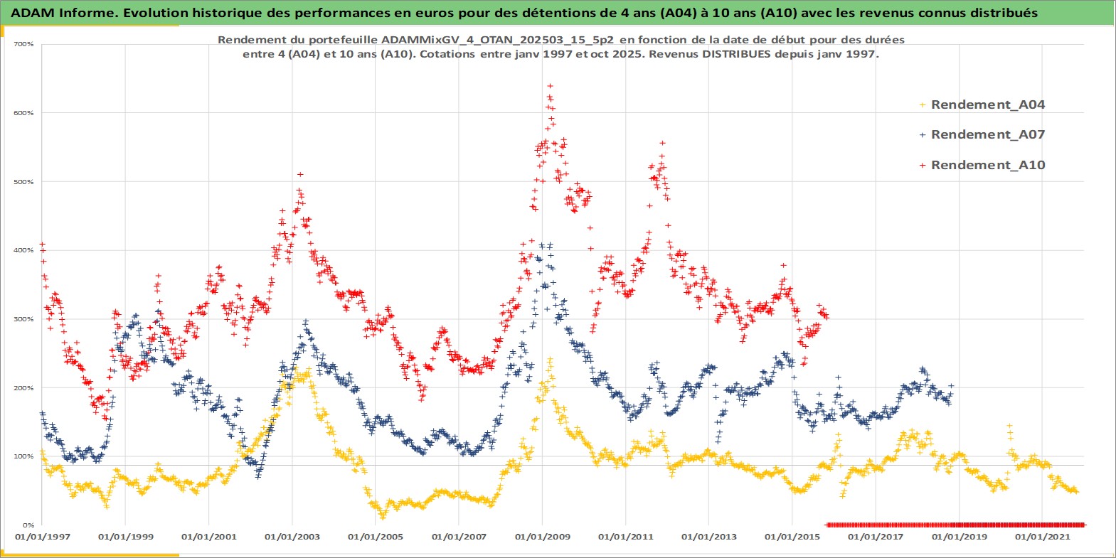 Site dédié aux investisseursPage dédiée sur site financeAnalyse des valorisations hebdomadaires du portefeuille ADAMMixGV_4_OTAN_202503_15_5p2_28actifs avec un profil P6_PurActions. Ce portefeuille est cote en EUR. Les valorisations couvrent les semaines 1997W01 a 2025W44. Les revenus de cet actif financier sont pris en compte depuis la semaine 1997W01. La note globale ESG de cet actif est estimee a 11.2 (apres rebasage entre 0 et 20).
