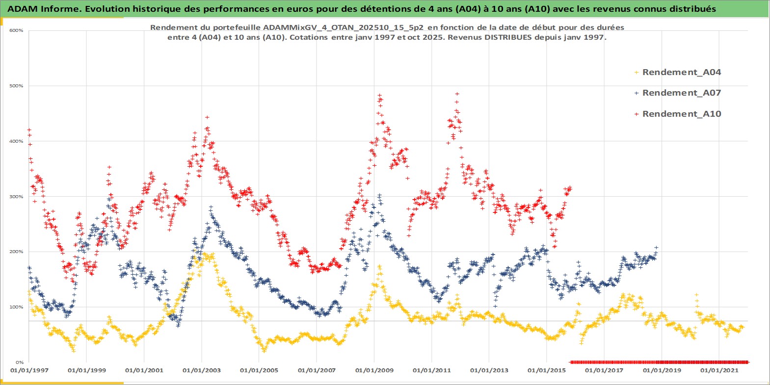 Site dédié aux investisseursPage dédiée sur site financeAnalyse des valorisations hebdomadaires du portefeuille ADAMMixGV_4_OTAN_202510_15_5p2_20actifs avec un profil P6_PurActions. Ce portefeuille est cote en EUR. Les valorisations couvrent les semaines 1997W01 a 2025W44. Les revenus de cet actif financier sont pris en compte depuis la semaine 1997W01. La note globale ESG de cet actif est estimee a 12.0 (apres rebasage entre 0 et 20).