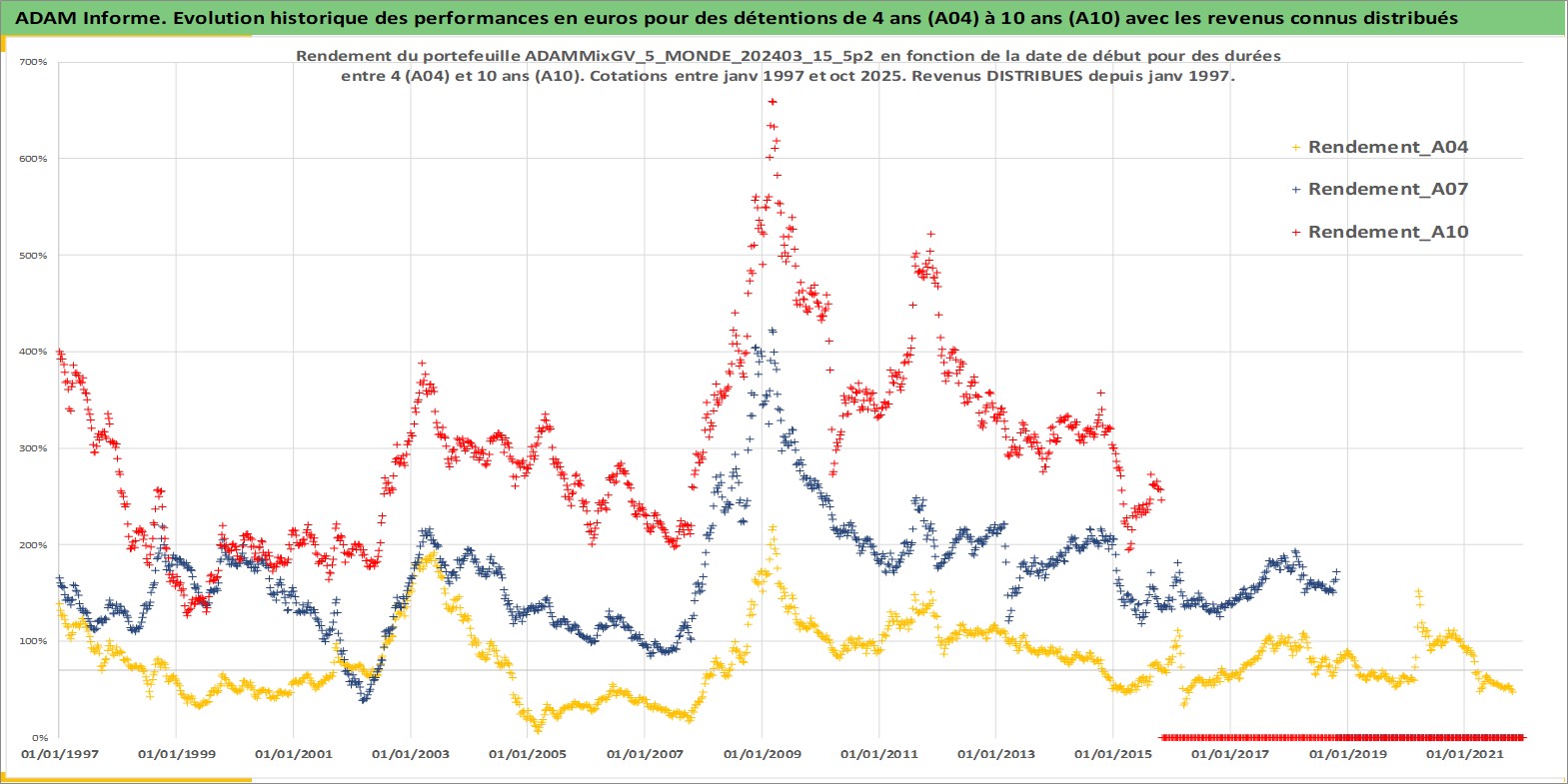 Site dédié aux investisseursPage dédiée sur site financeAnalyse des valorisations hebdomadaires du portefeuille ADAMMixGV_5_MONDE_202403_15_5p2_77actifs avec un profil P6_PurActions. Ce portefeuille est cote en EUR. Les valorisations couvrent les semaines 1997W01 a 2025W44. Les revenus de cet actif financier sont pris en compte depuis la semaine 1997W01. La note globale ESG de cet actif est estimee a 10.0 (apres rebasage entre 0 et 20).