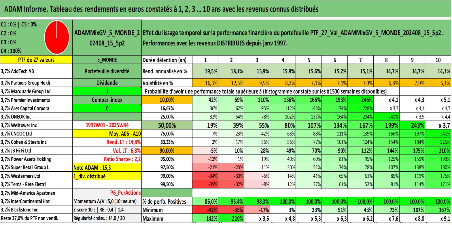 Site dédié aux investisseursPage dédiée sur site financeAnalyse des valorisations hebdomadaires du portefeuille ADAMMixGV_5_MONDE_202408_15_5p2_27actifs avec un profil P6_PurActions. Ce portefeuille est cote en EUR. Les valorisations couvrent les semaines 1997W01 a 2025W44. Les revenus de cet actif financier sont pris en compte depuis la semaine 1997W01. La note globale ESG de cet actif est estimee a 9.3 (apres rebasage entre 0 et 20).