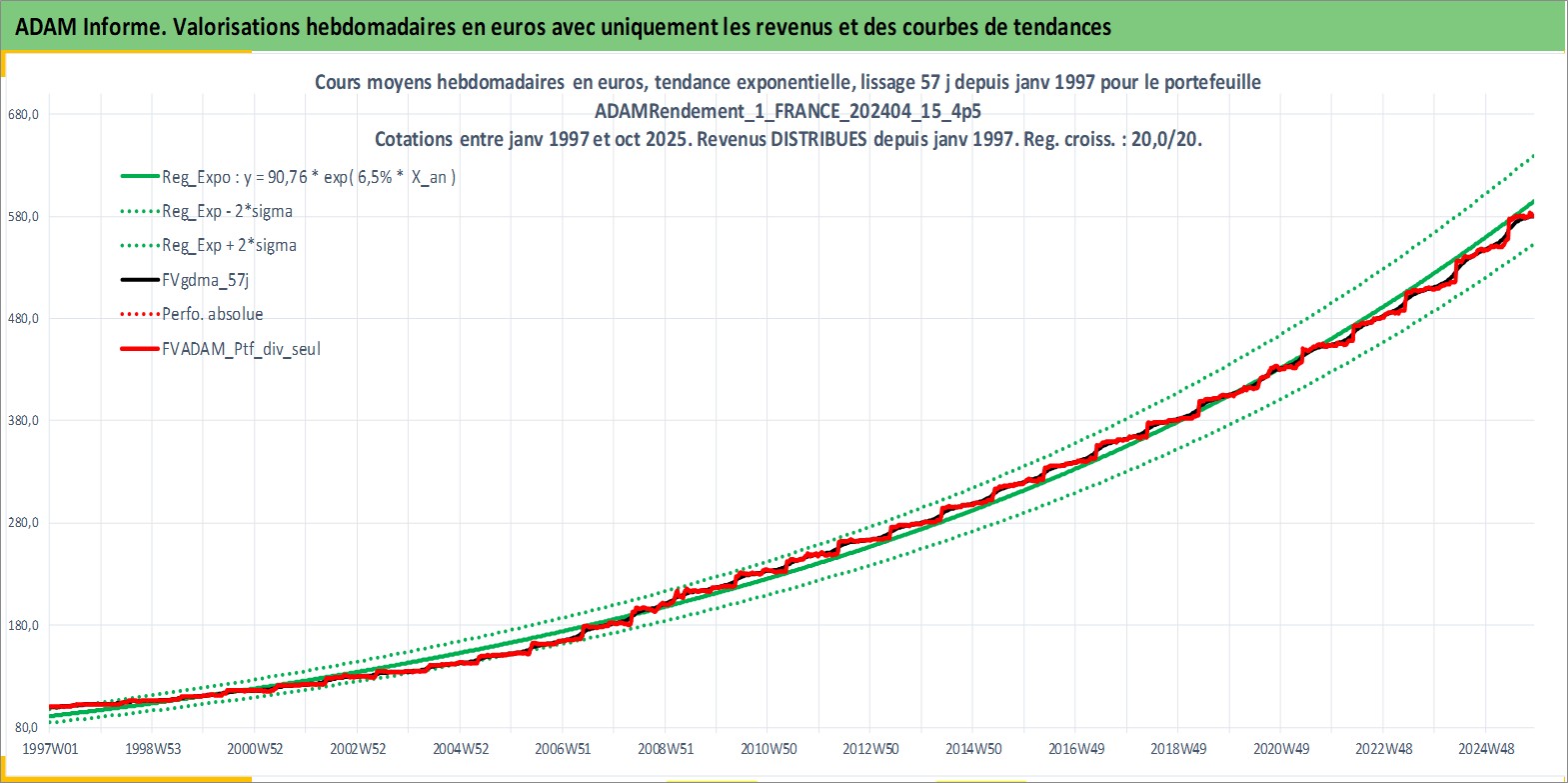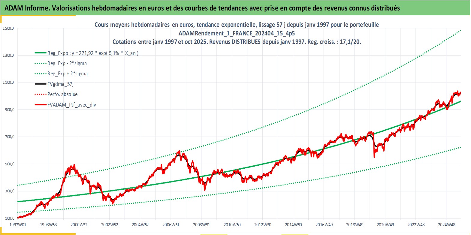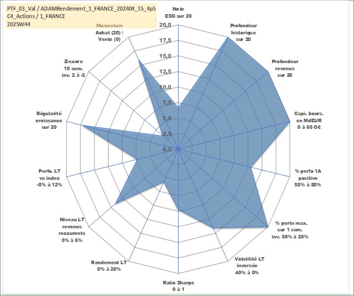 Site dédié aux investisseursPage dédiée sur site financeAnalyse des valorisations hebdomadaires du portefeuille ADAMRendement_1_FRANCE_202404_15_4p5_3actifs avec un profil P6_PurActions. Ce portefeuille est cote en EUR. Les valorisations couvrent les semaines 1997W01 a 2025W44. Les revenus de cet actif financier sont pris en compte depuis la semaine 1997W01. La note globale ESG de cet actif est estimee a 6.7 (apres rebasage entre 0 et 20).