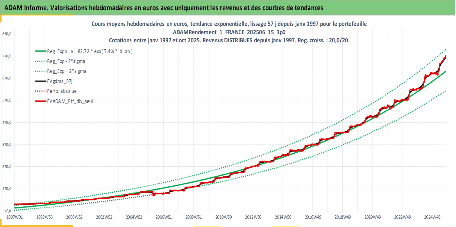 Site dédié aux investisseursPage dédiée sur site financeAnalyse des valorisations hebdomadaires du portefeuille ADAMRendement_1_FRANCE_202506_15_3p0_3actifs avec un profil P6_PurActions. Ce portefeuille est cote en EUR. Les valorisations couvrent les semaines 1997W01 a 2025W44. Les revenus de cet actif financier sont pris en compte depuis la semaine 1997W01. La note globale ESG de cet actif est estimee a 11.3 (apres rebasage entre 0 et 20).