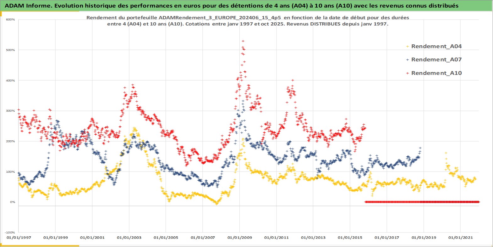 Site dédié aux investisseursPage dédiée sur site financeAnalyse des valorisations hebdomadaires du portefeuille ADAMRendement_3_EUROPE_202406_15_4p5_18actifs avec un profil P6_PurActions. Ce portefeuille est cote en EUR. Les valorisations couvrent les semaines 1997W01 a 2025W44. Les revenus de cet actif financier sont pris en compte depuis la semaine 1997W01. La note globale ESG de cet actif est estimee a 10.4 (apres rebasage entre 0 et 20).