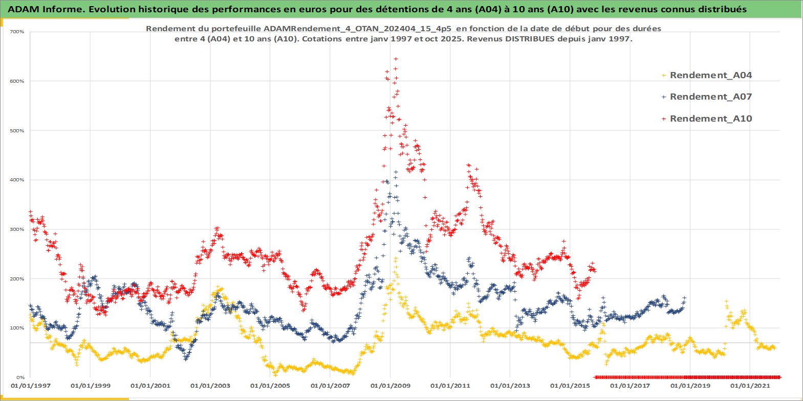 Site dédié aux investisseursPage dédiée sur site financeAnalyse des valorisations hebdomadaires du portefeuille ADAMRendement_4_OTAN_202404_15_4p5_46actifs avec un profil P6_PurActions. Ce portefeuille est cote en EUR. Les valorisations couvrent les semaines 1997W01 a 2025W44. Les revenus de cet actif financier sont pris en compte depuis la semaine 1997W01. La note globale ESG de cet actif est estimee a 10.3 (apres rebasage entre 0 et 20).
