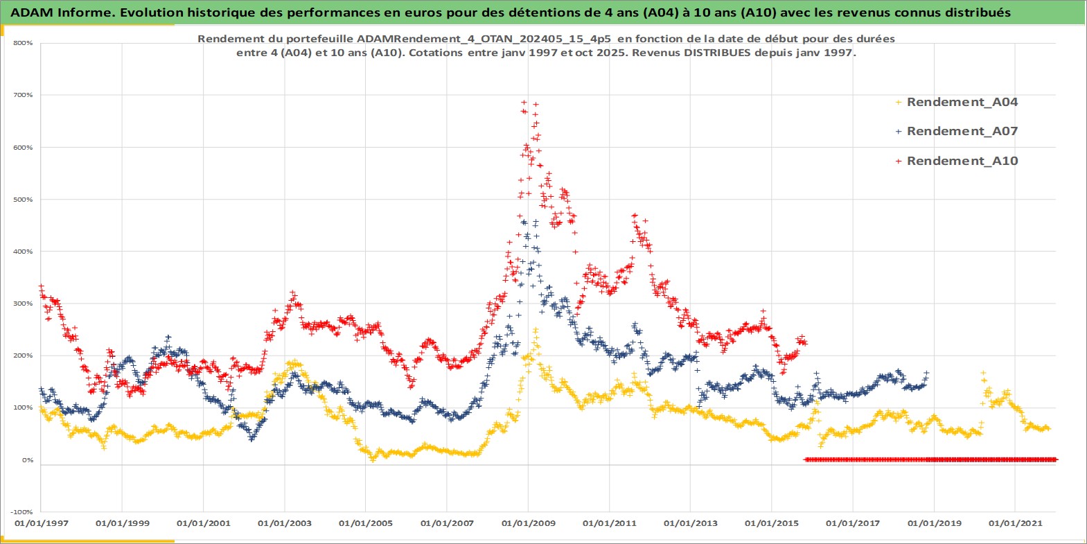 Site dédié aux investisseursPage dédiée sur site financeAnalyse des valorisations hebdomadaires du portefeuille ADAMRendement_4_OTAN_202405_15_4p5_39actifs avec un profil P6_PurActions. Ce portefeuille est cote en EUR. Les valorisations couvrent les semaines 1997W01 a 2025W44. Les revenus de cet actif financier sont pris en compte depuis la semaine 1997W01. La note globale ESG de cet actif est estimee a 10.5 (apres rebasage entre 0 et 20).