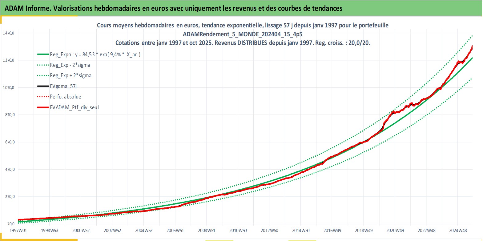 Site dédié aux investisseursPage dédiée sur site financeAnalyse des valorisations hebdomadaires du portefeuille ADAMRendement_5_MONDE_202404_15_4p5_59actifs avec un profil P6_PurActions. Ce portefeuille est cote en EUR. Les valorisations couvrent les semaines 1997W01 a 2025W44. Les revenus de cet actif financier sont pris en compte depuis la semaine 1997W01. La note globale ESG de cet actif est estimee a 9.6 (apres rebasage entre 0 et 20).