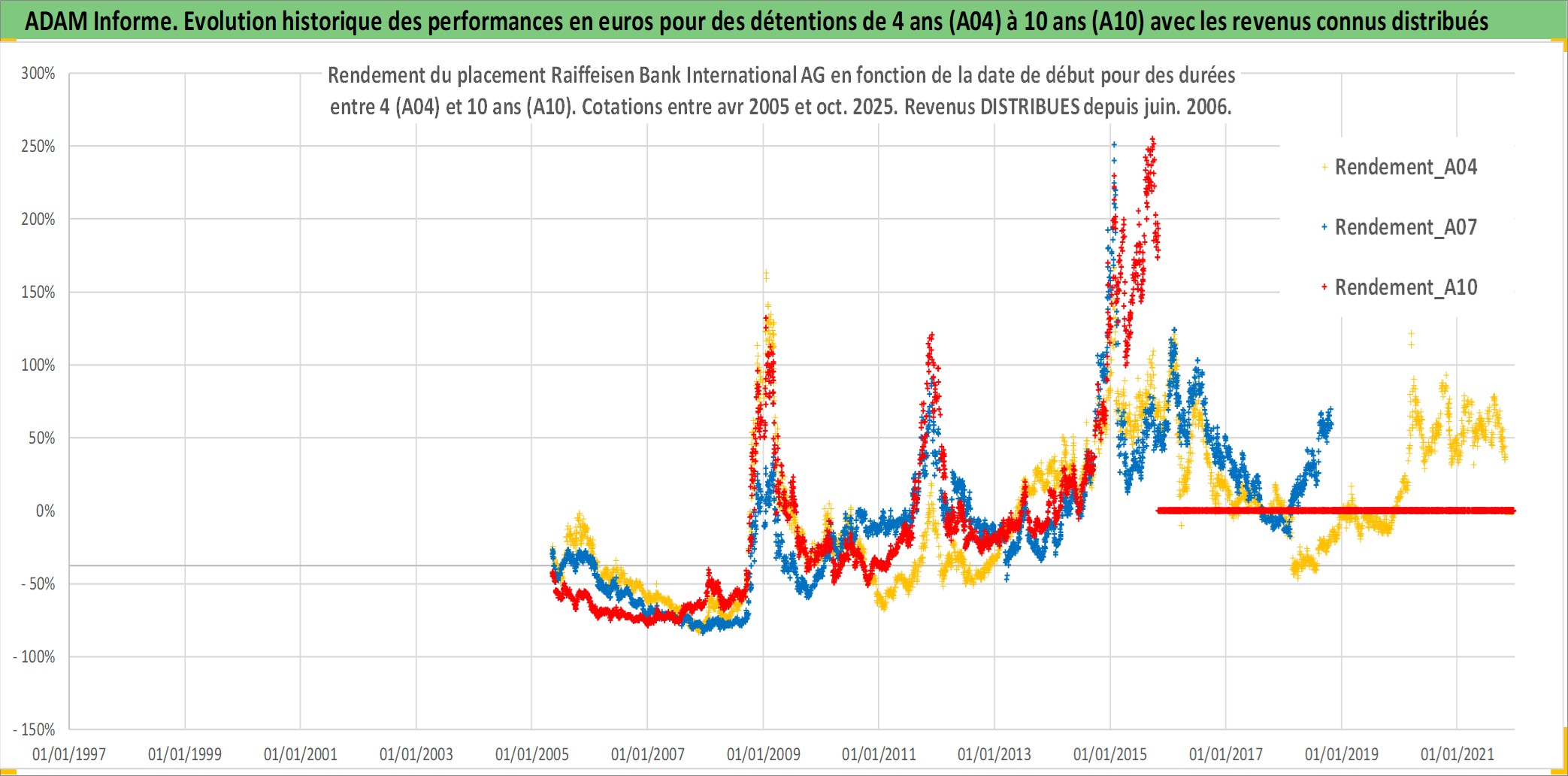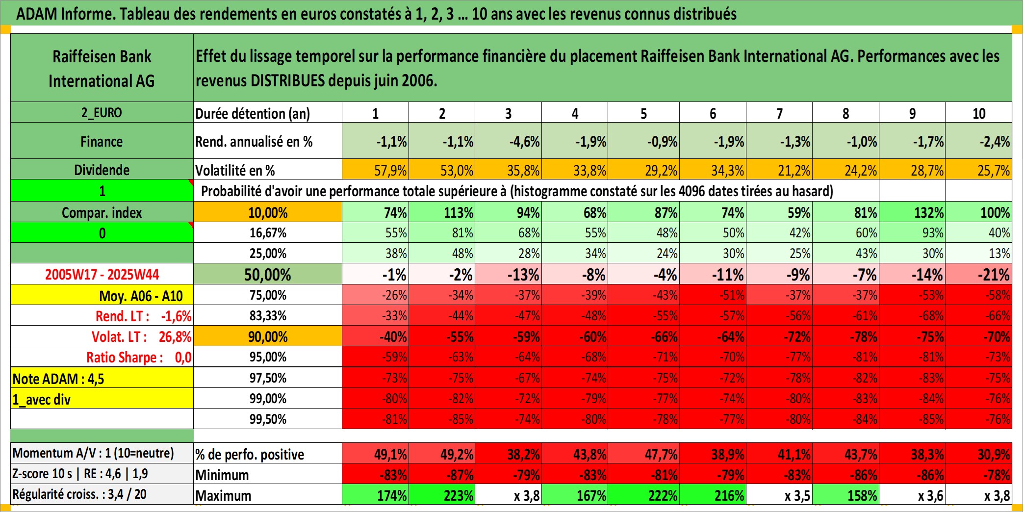 Site dédié aux investisseursPage dédiée sur site financeAnalyse des valorisations hebdomadaires de l'action Raiffeisen Bank International AG. Cet actif est cote en EUR. Les valorisations couvrent les semaines 2005W17 a 2025W44. Les revenus de cet actif financier sont pris en compte depuis la semaine 2006W24. La note globale ESG de cet actif est estimee a 12.0 (apres rebasage entre 0 et 20).