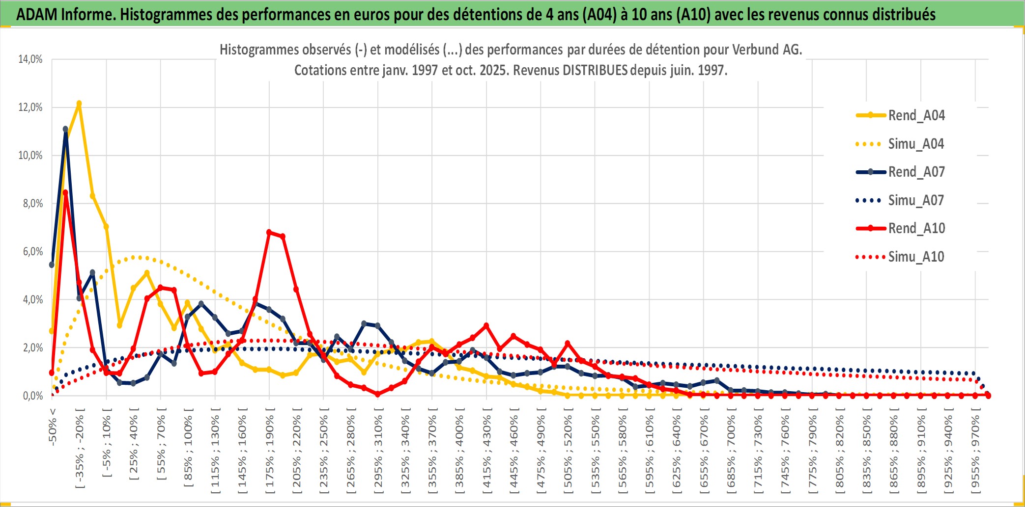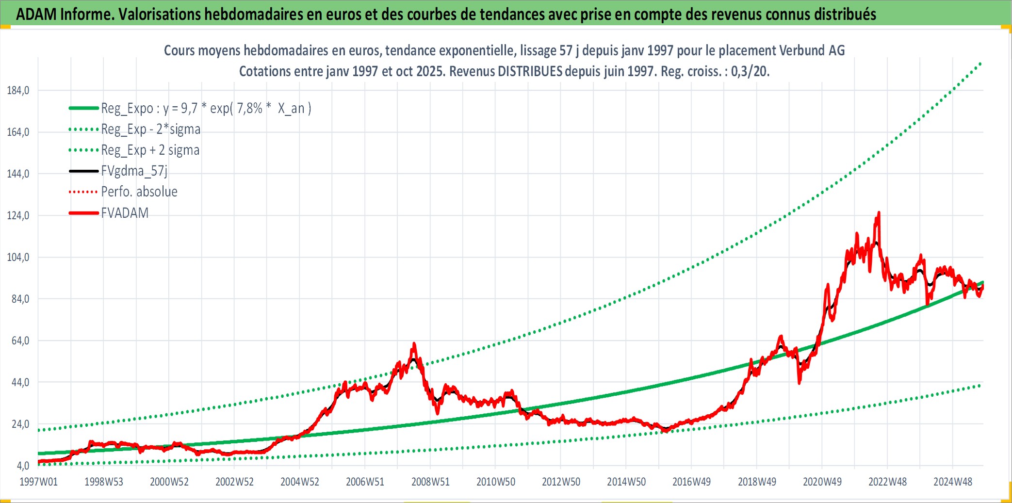 Site dédié aux investisseursPage dédiée sur site financeAnalyse des valorisations hebdomadaires de l'action Verbund AG. Cet actif est cote en EUR. Les valorisations couvrent les semaines 1997W01 a 2025W44. Les revenus de cet actif financier sont pris en compte depuis la semaine 1997W24. La note globale ESG de cet actif est estimee a 11.0 (apres rebasage entre 0 et 20).