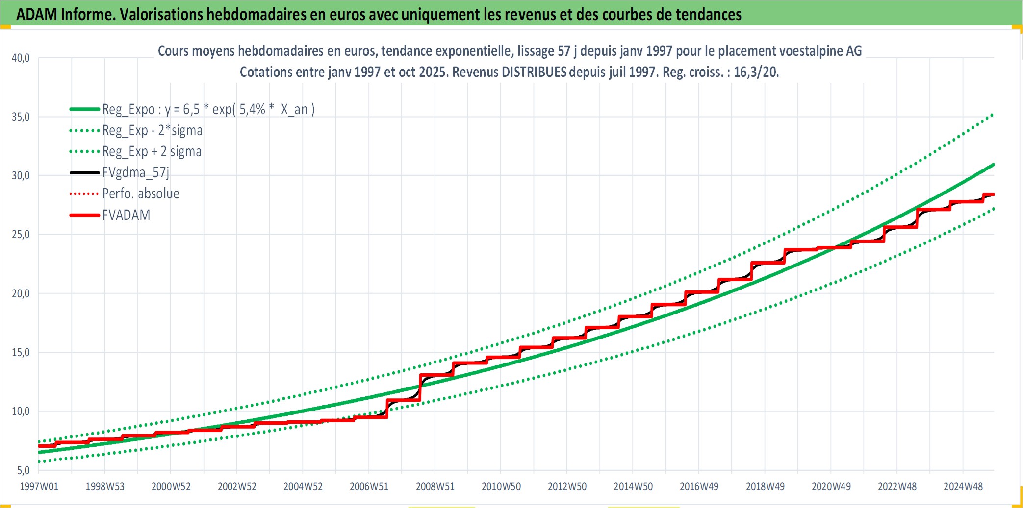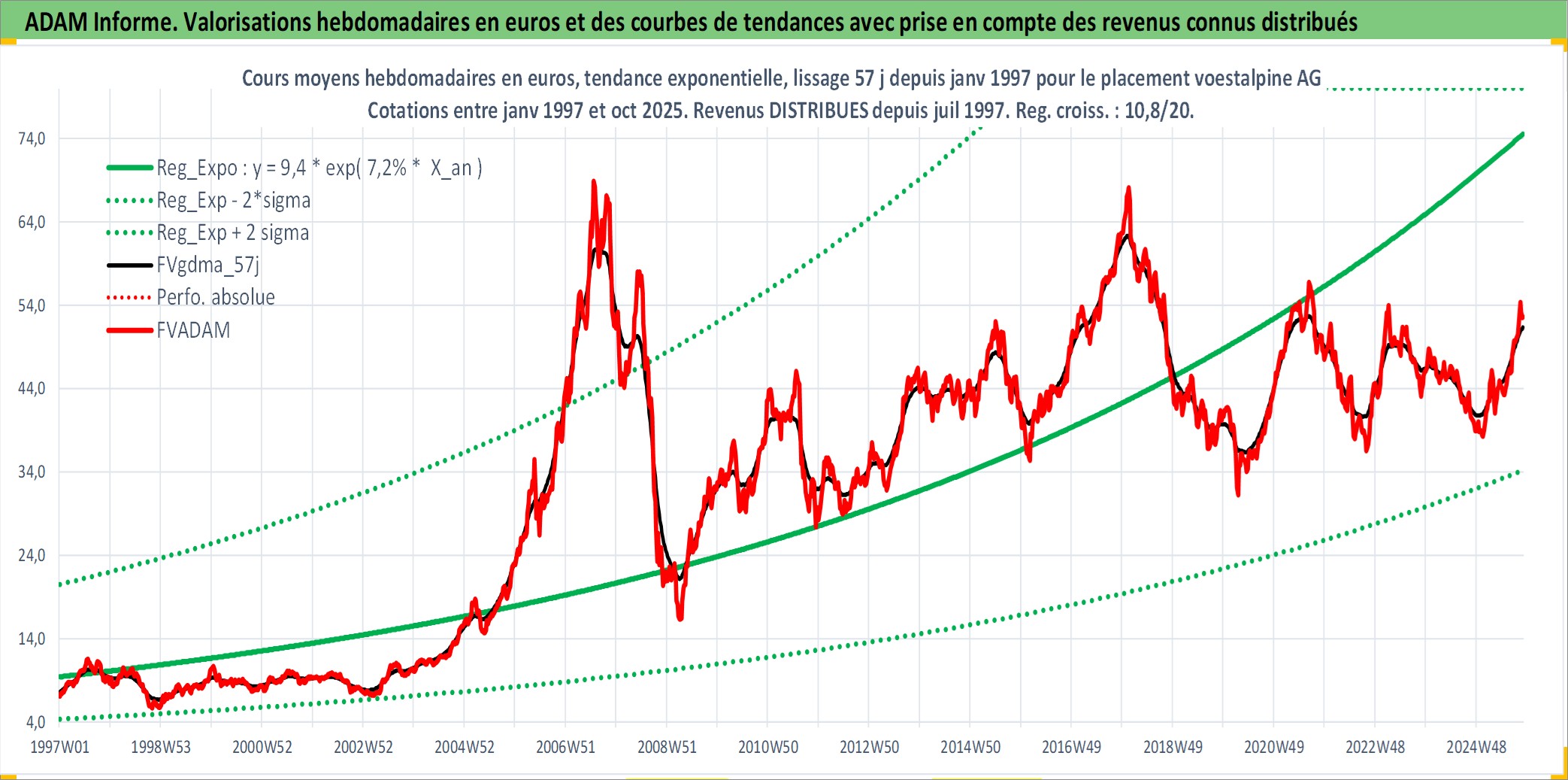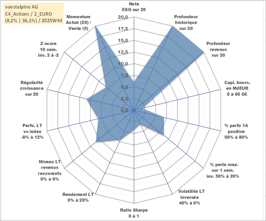 Site dédié aux investisseursPage dédiée sur site financeAnalyse des valorisations hebdomadaires de l'action voestalpine AG. Cet actif est cote en EUR. Les valorisations couvrent les semaines 1997W01 a 2025W44. Les revenus de cet actif financier sont pris en compte depuis la semaine 1997W28. La note globale ESG de cet actif est estimee a 6.0 (apres rebasage entre 0 et 20).