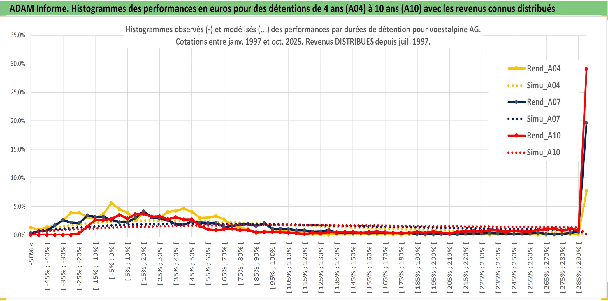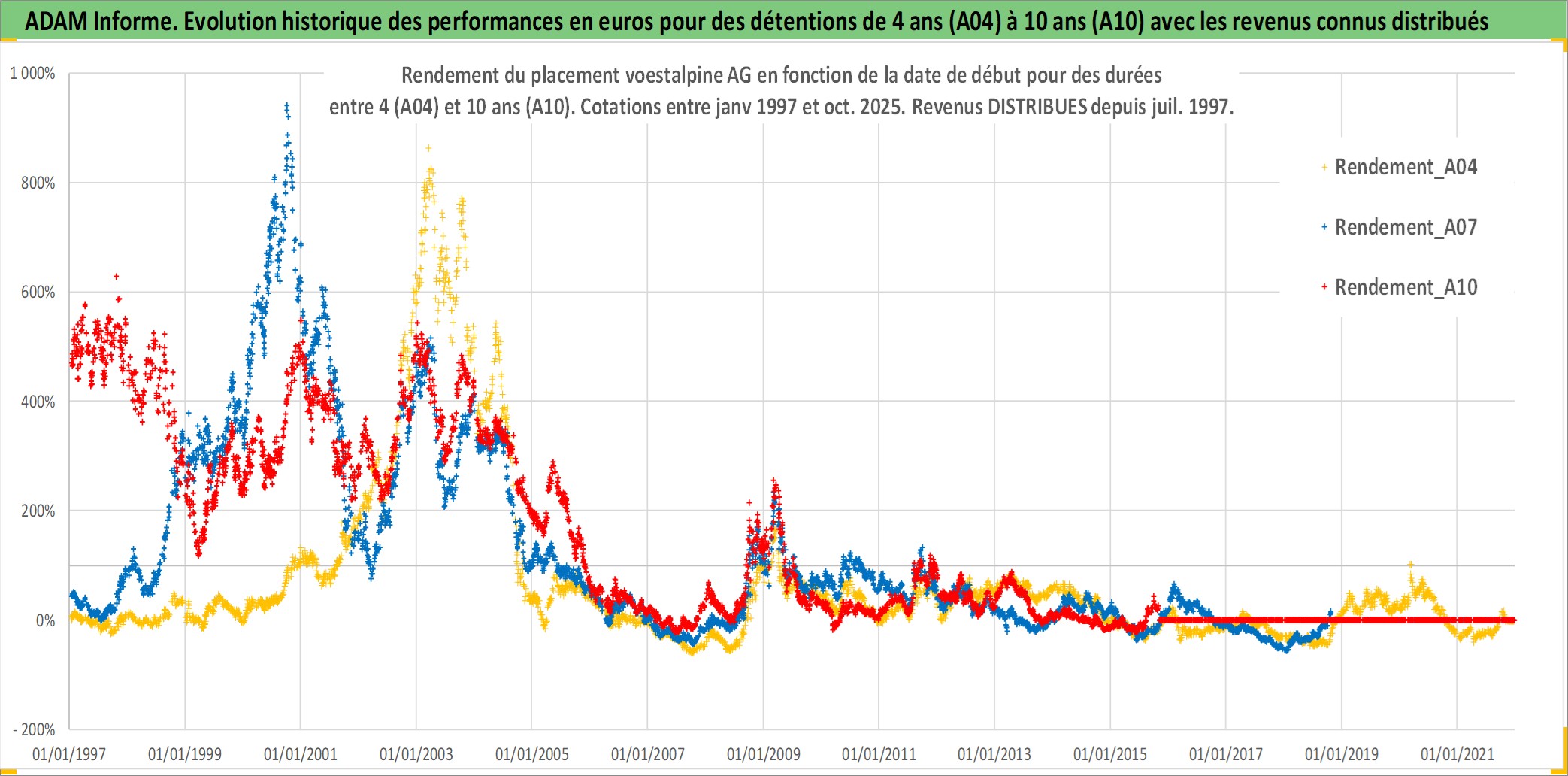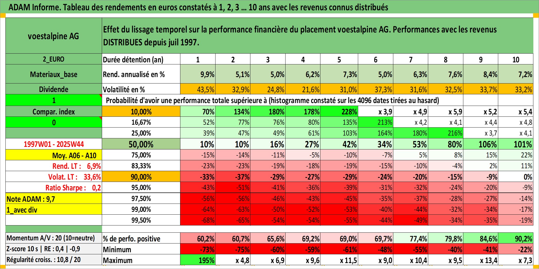 Site dédié aux investisseursPage dédiée sur site financeAnalyse des valorisations hebdomadaires de l'action voestalpine AG. Cet actif est cote en EUR. Les valorisations couvrent les semaines 1997W01 a 2025W44. Les revenus de cet actif financier sont pris en compte depuis la semaine 1997W28. La note globale ESG de cet actif est estimee a 6.0 (apres rebasage entre 0 et 20).
