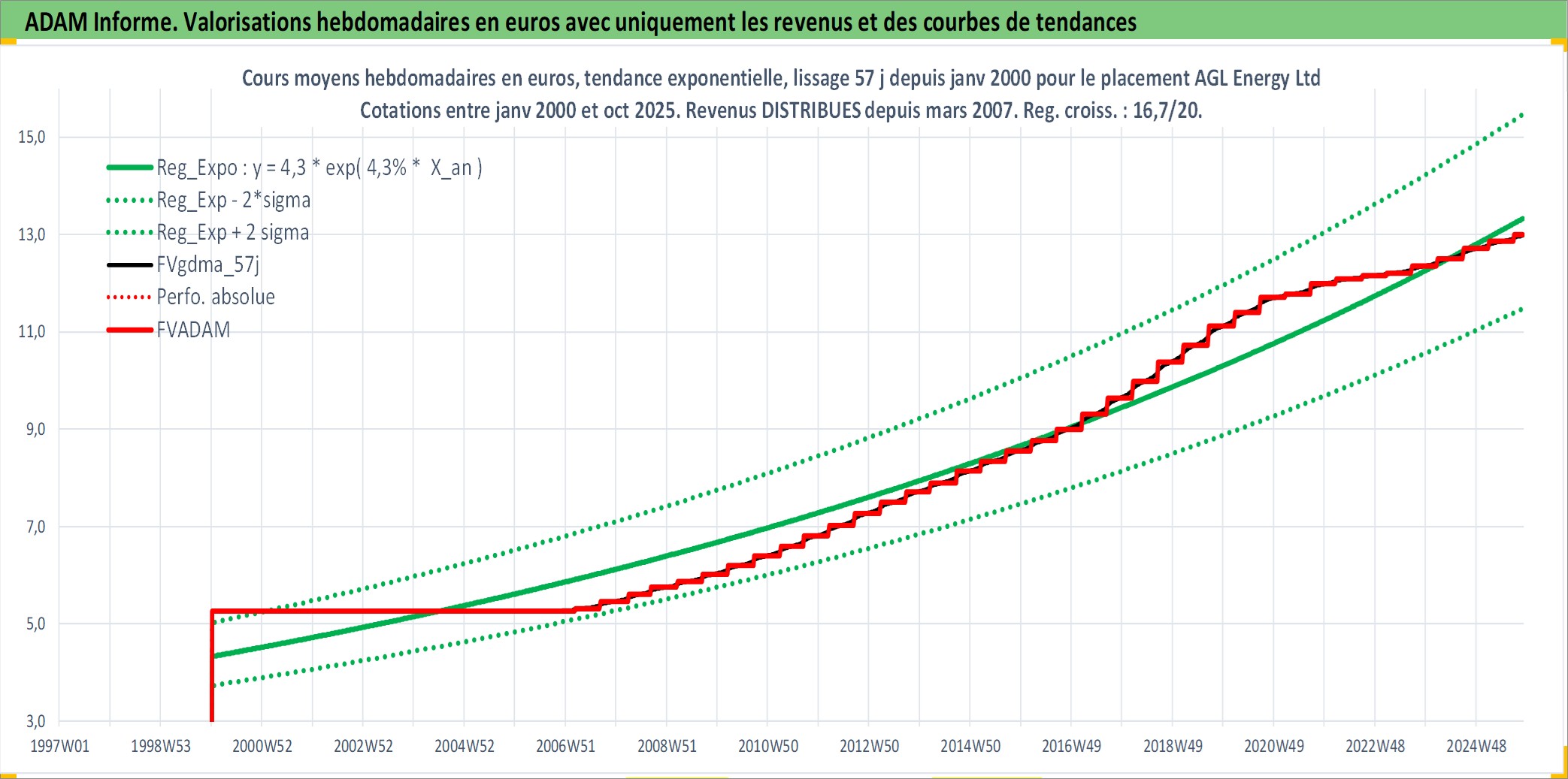 Site dédié aux investisseursPage dédiée sur site financeAnalyse des valorisations hebdomadaires de l'action AGL Energy Ltd. Cet actif est cote en AUD. Les valorisations sont en contrevaleur EURO et couvrent les semaines 2000W01 a 2025W44. Les revenus de cet actif financier sont pris en compte depuis la semaine 2007W09. La note globale ESG de cet actif est estimee a 4.0 (apres rebasage entre 0 et 20).