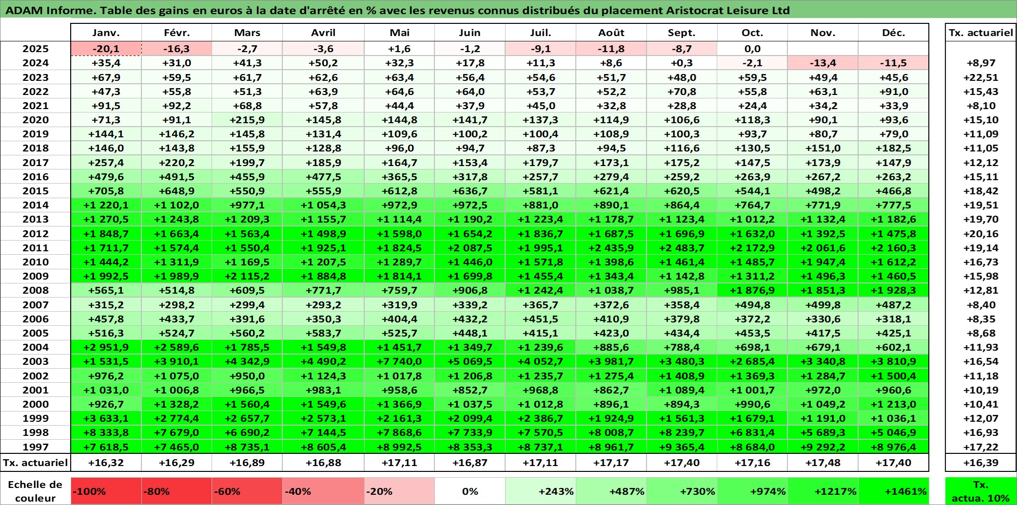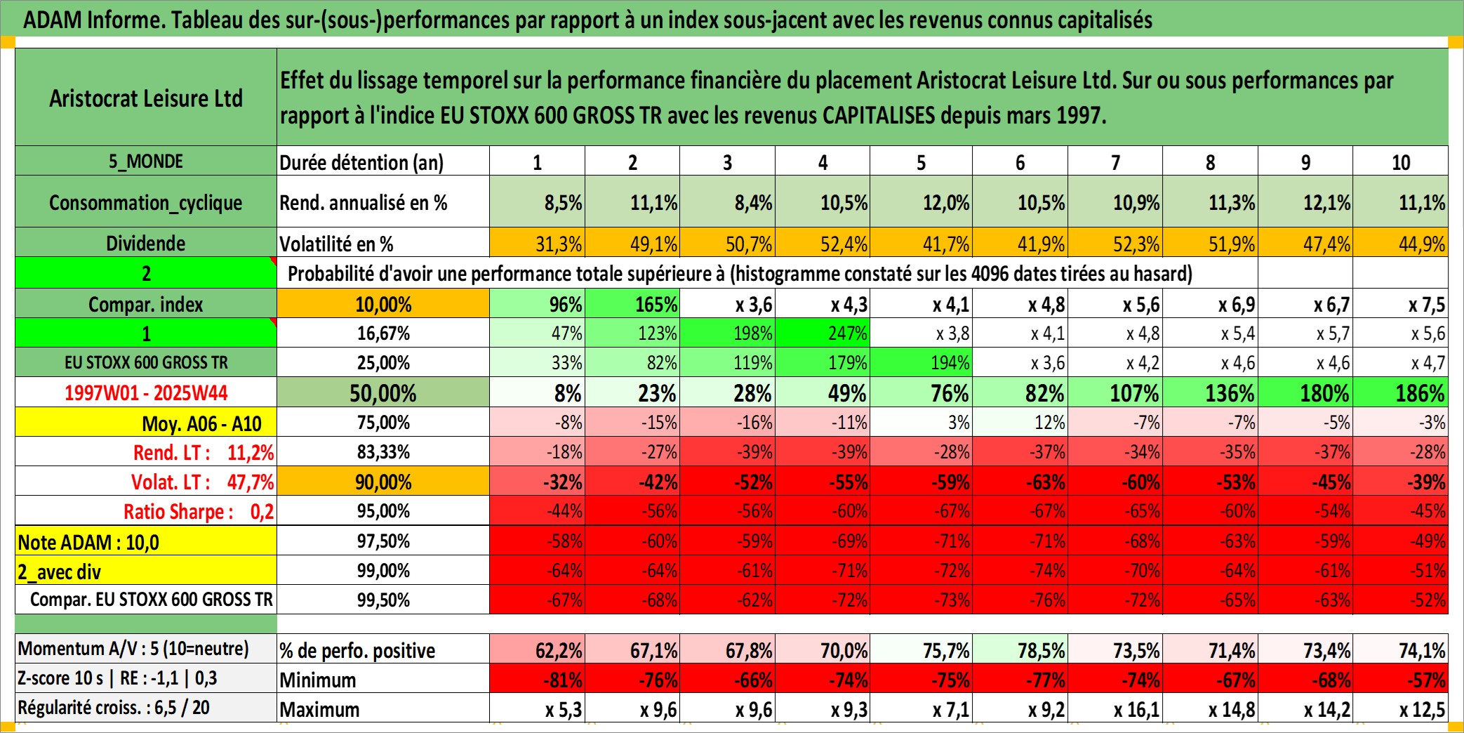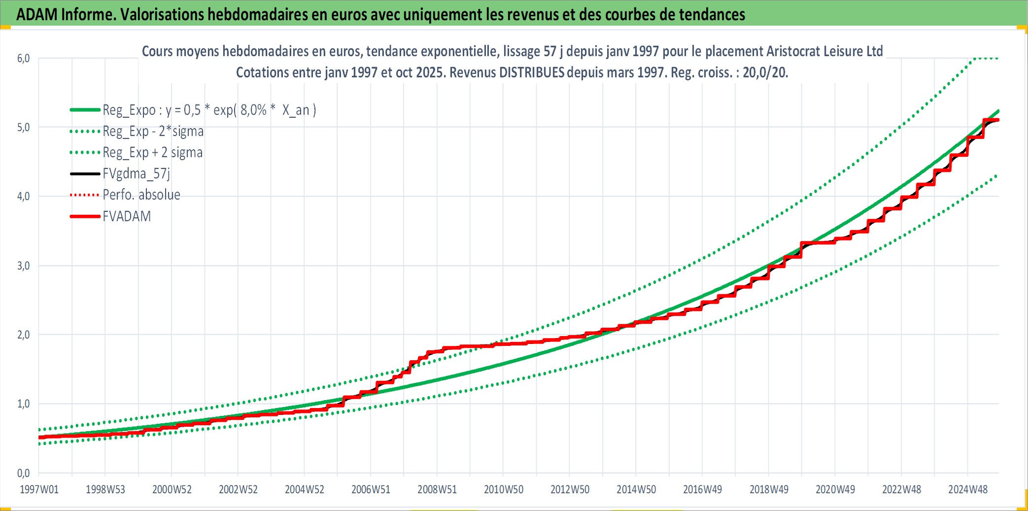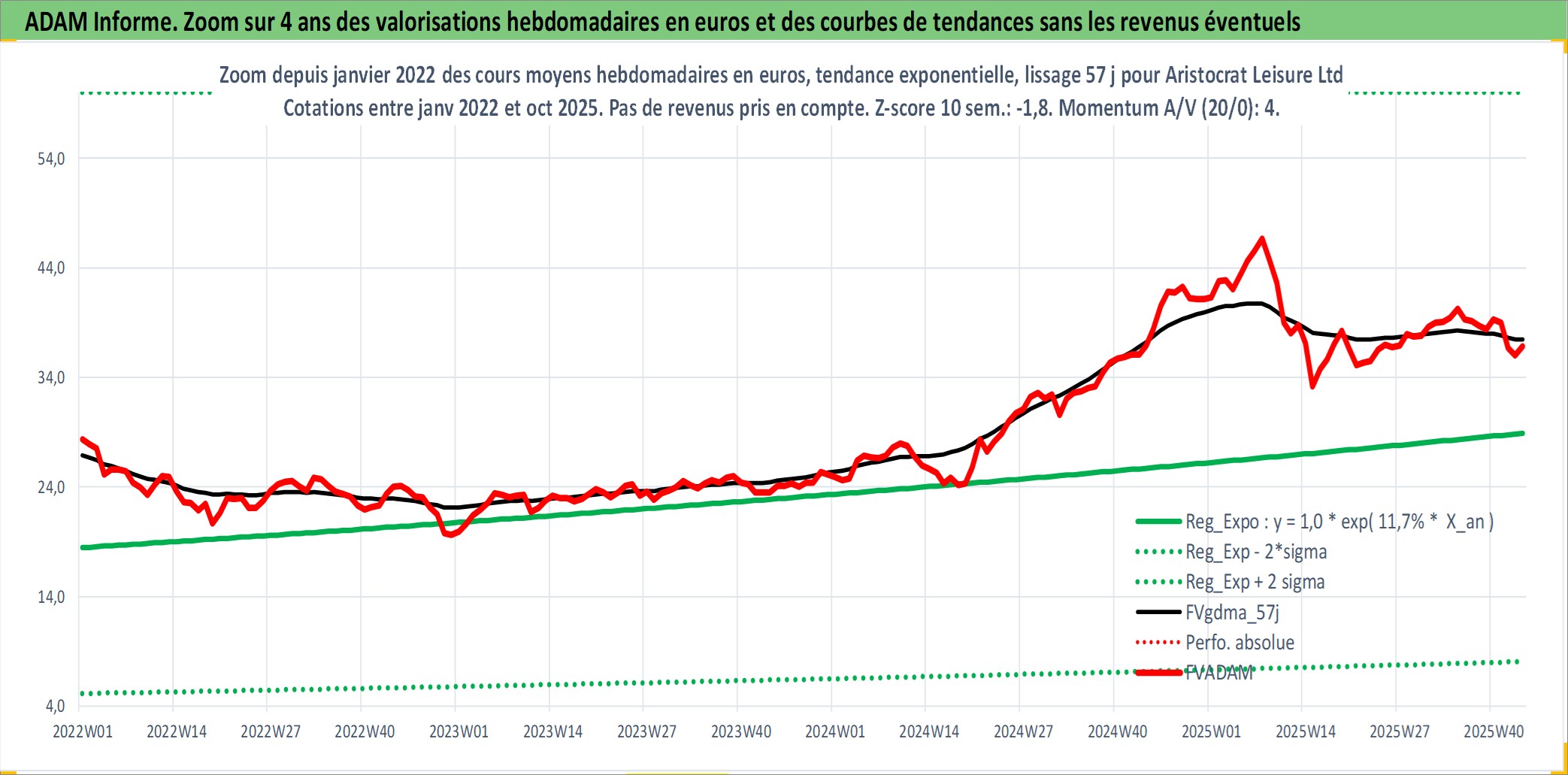 Site dédié aux investisseursPage dédiée sur site financeAnalyse des valorisations hebdomadaires de l'action Aristocrat Leisure Ltd. Cet actif est cote en AUD. Les valorisations sont en contrevaleur EURO et couvrent les semaines 1997W01 a 2025W44. Les revenus de cet actif financier sont pris en compte depuis la semaine 1997W10. La note globale ESG de cet actif est estimee a 9.0 (apres rebasage entre 0 et 20).