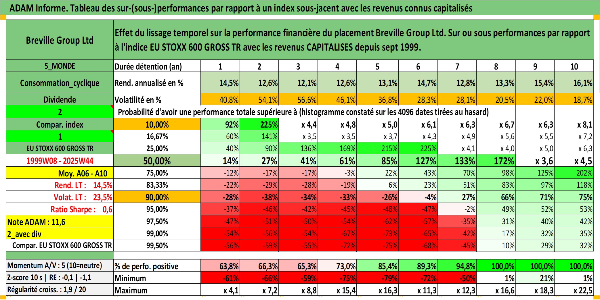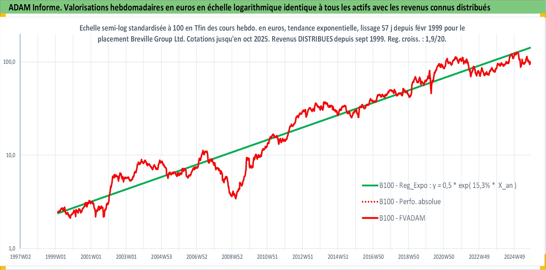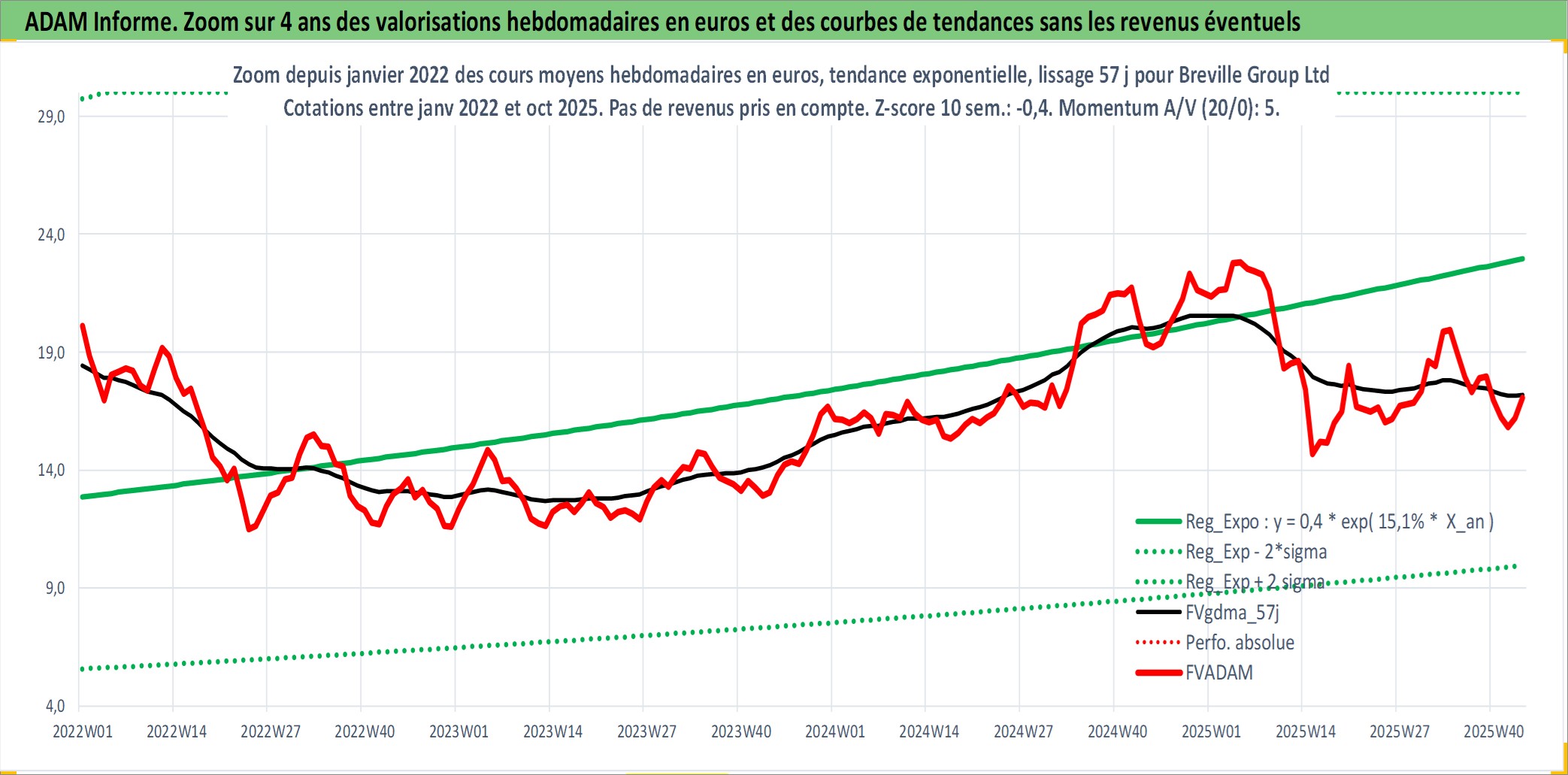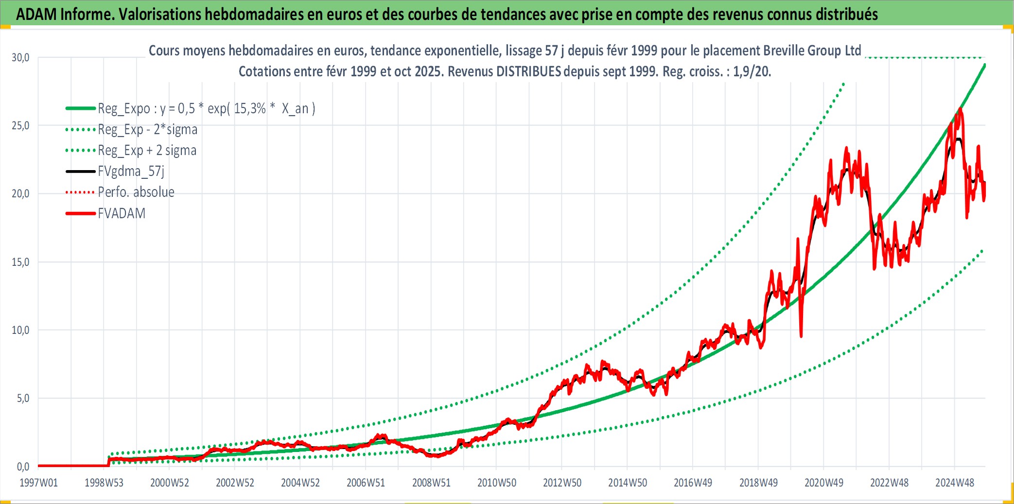 Site dédié aux investisseursPage dédiée sur site financeAnalyse des valorisations hebdomadaires de l'action Breville Group Ltd. Cet actif est cote en AUD. Les valorisations sont en contrevaleur EURO et couvrent les semaines 1999W08 a 2025W44. Les revenus de cet actif financier sont pris en compte depuis la semaine 1999W38. La note ESG de cet actif n'est pas connue.