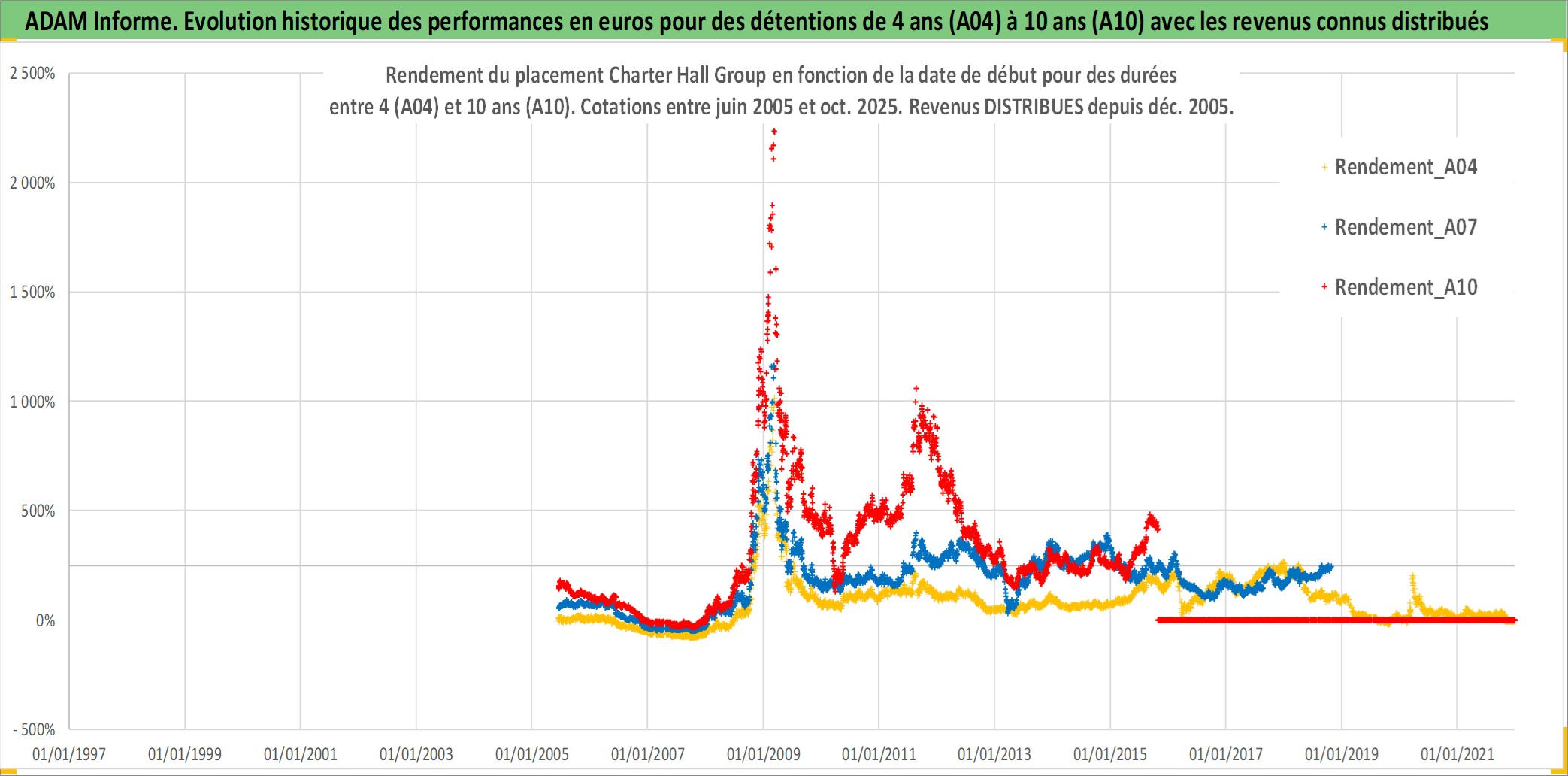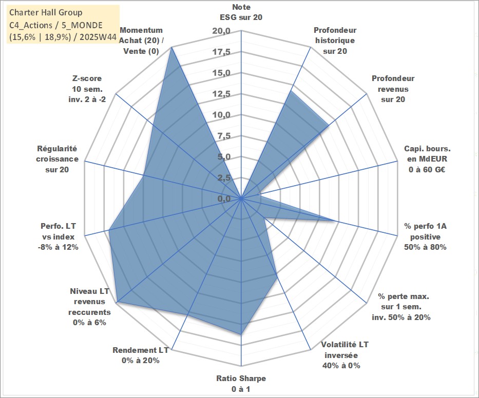 Site dédié aux investisseursPage dédiée sur site financeAnalyse des valorisations hebdomadaires de l'action Charter Hall Group. Cet actif est cote en AUD. Les valorisations sont en contrevaleur EURO et couvrent les semaines 2005W23 a 2025W44. Les revenus de cet actif financier sont pris en compte depuis la semaine 2005W51. La note ESG de cet actif n'est pas connue.