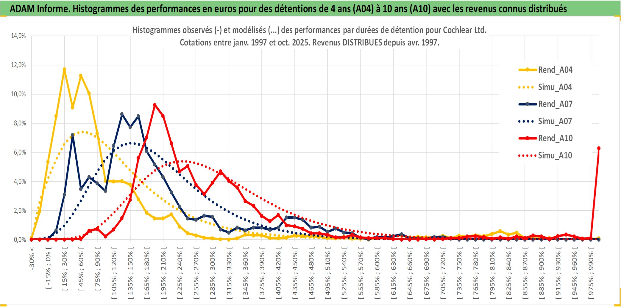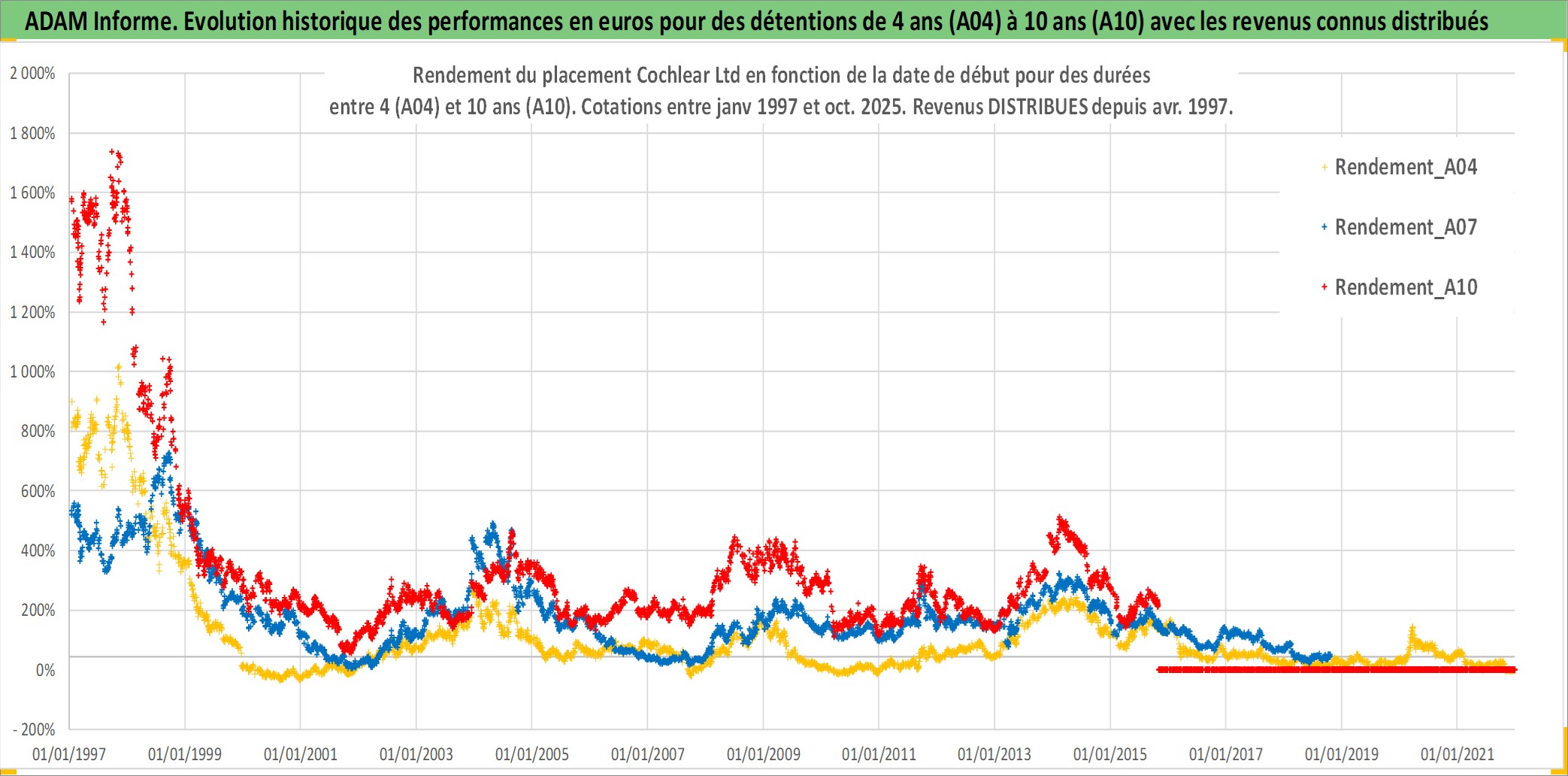 Site dédié aux investisseursPage dédiée sur site financeAnalyse des valorisations hebdomadaires de l'action Cochlear Ltd. Cet actif est cote en AUD. Les valorisations sont en contrevaleur EURO et couvrent les semaines 1997W01 a 2025W44. Les revenus de cet actif financier sont pris en compte depuis la semaine 1997W14. La note globale ESG de cet actif est estimee a 6.0 (apres rebasage entre 0 et 20).