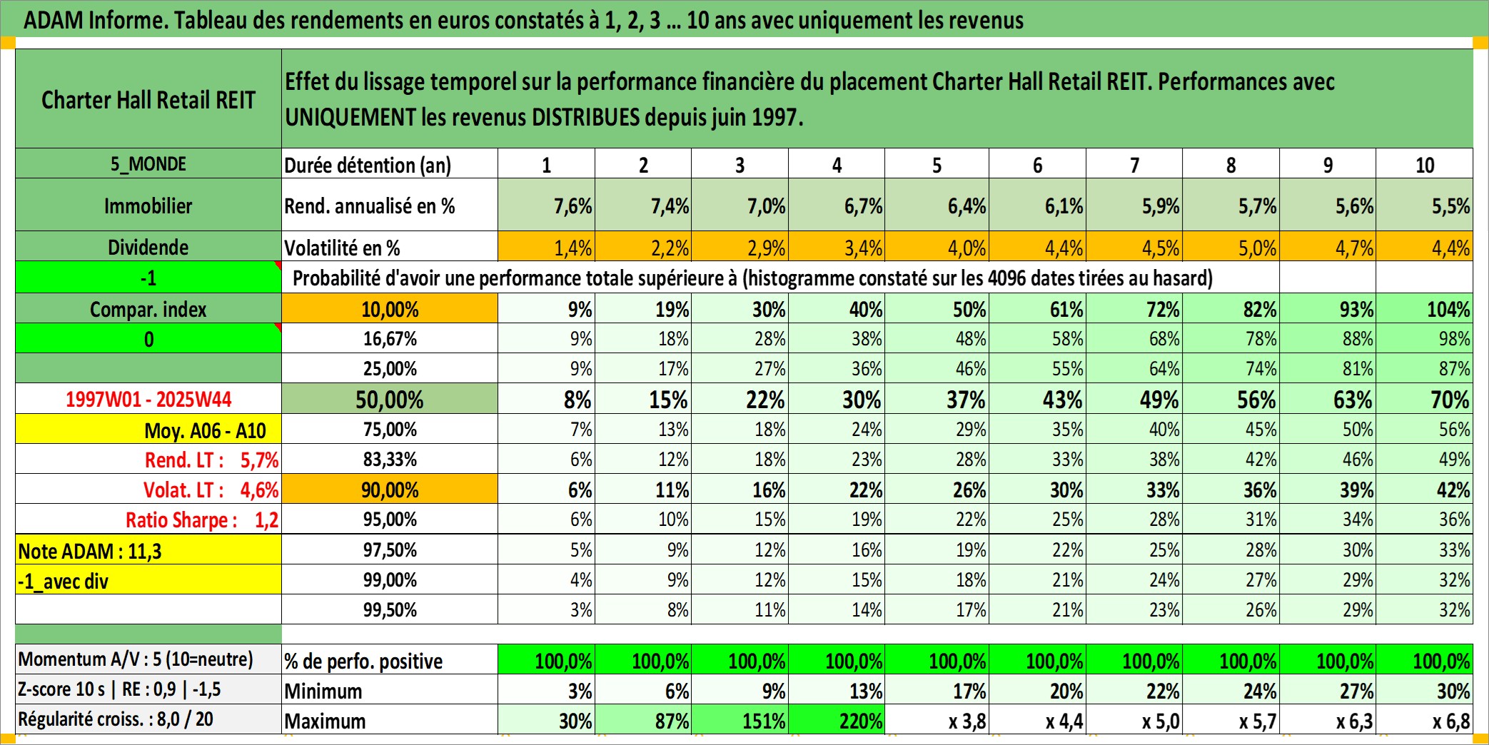 Site dédié aux investisseursPage dédiée sur site financeAnalyse des valorisations hebdomadaires de l'action Charter Hall Retail REIT. Cet actif est cote en AUD. Les valorisations sont en contrevaleur EURO et couvrent les semaines 1997W01 a 2025W44. Les revenus de cet actif financier sont pris en compte depuis la semaine 1997W26. La note ESG de cet actif n'est pas connue.