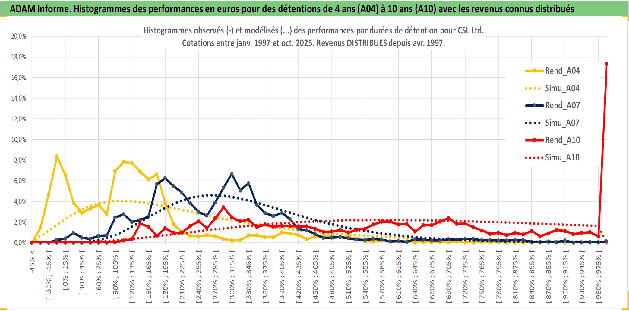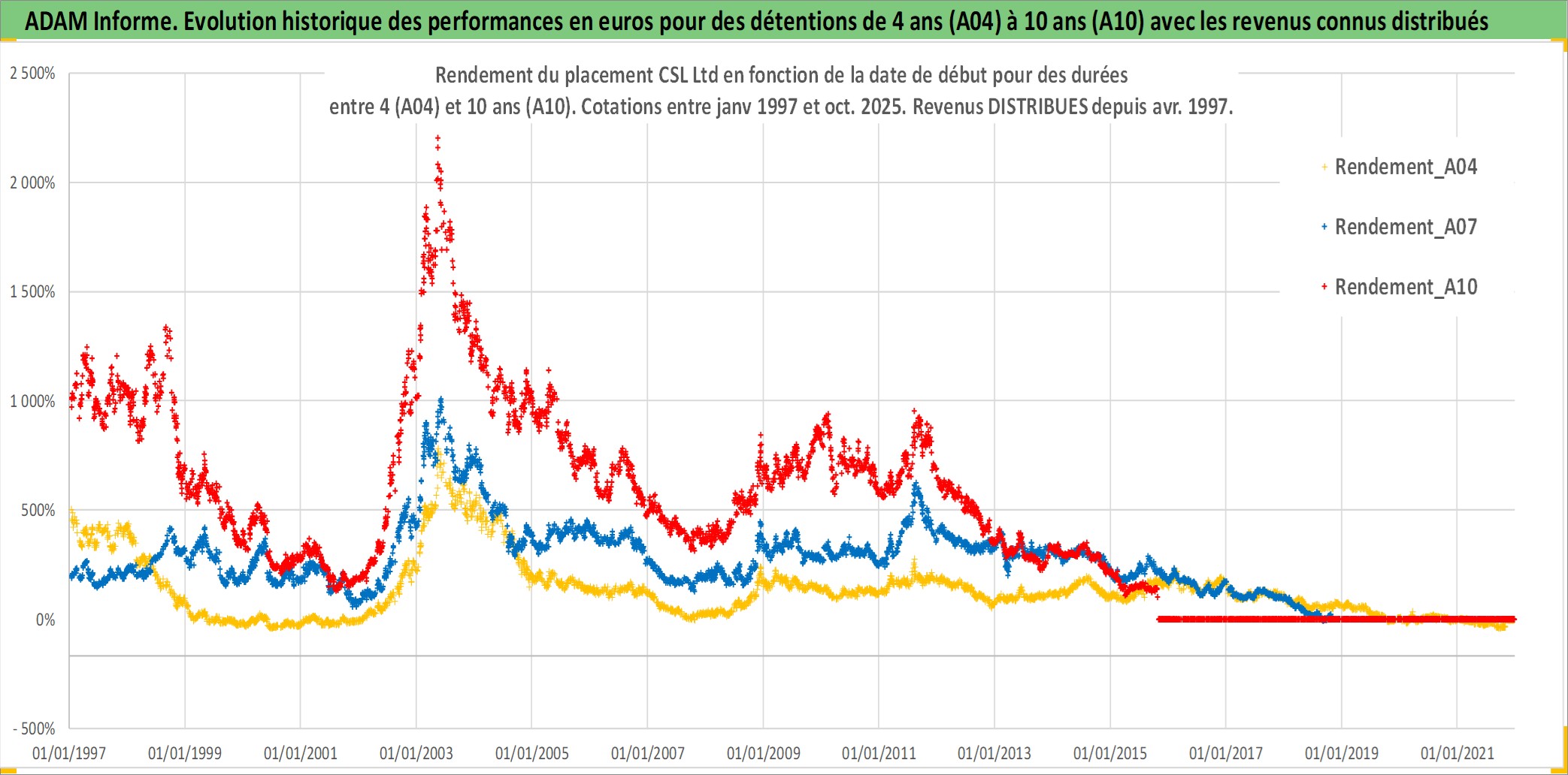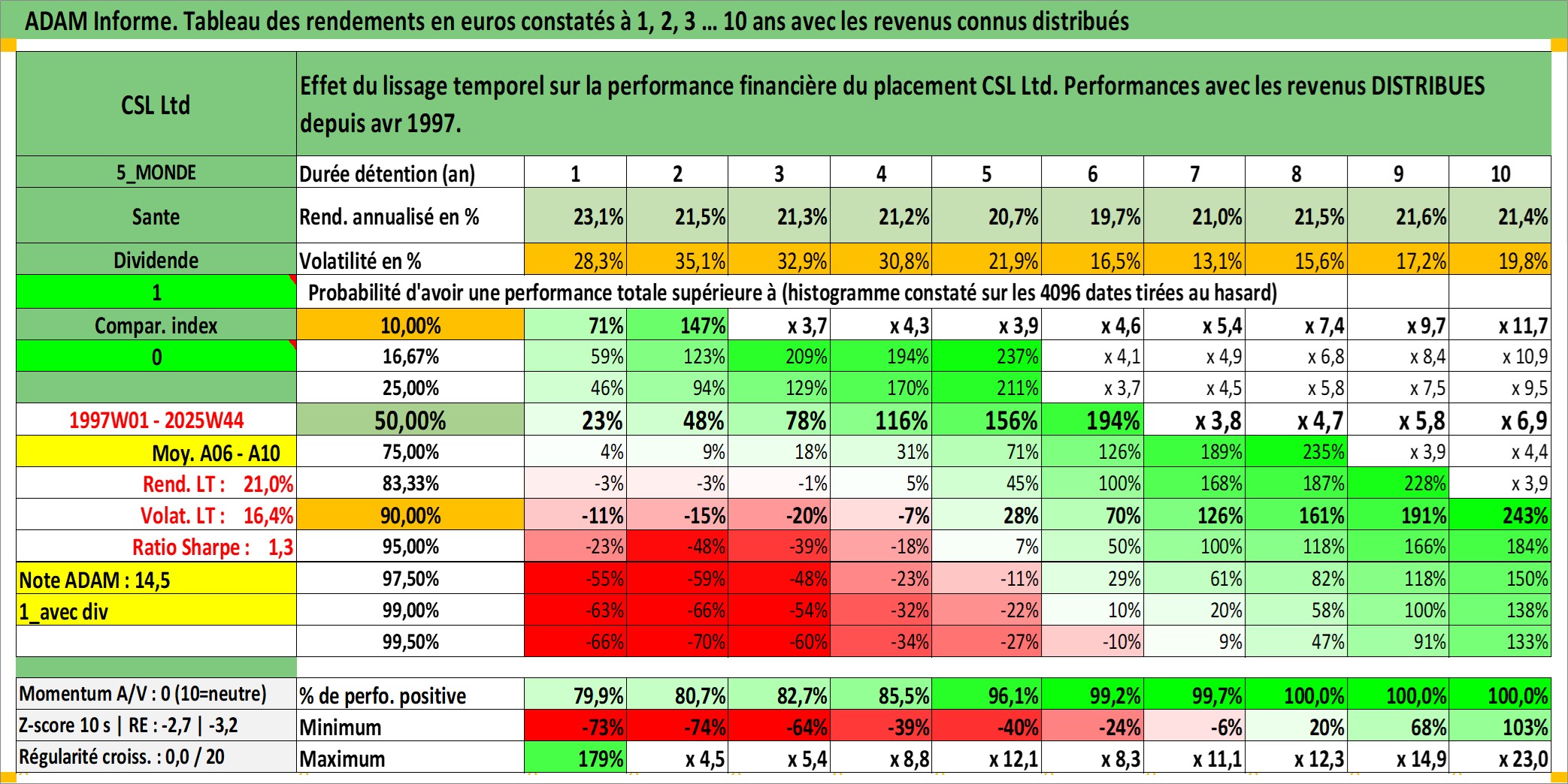 Site dédié aux investisseursPage dédiée sur site financeAnalyse des valorisations hebdomadaires de l'action CSL Ltd. Cet actif est cote en AUD. Les valorisations sont en contrevaleur EURO et couvrent les semaines 1997W01 a 2025W44. Les revenus de cet actif financier sont pris en compte depuis la semaine 1997W15. La note globale ESG de cet actif est estimee a 8.0 (apres rebasage entre 0 et 20).