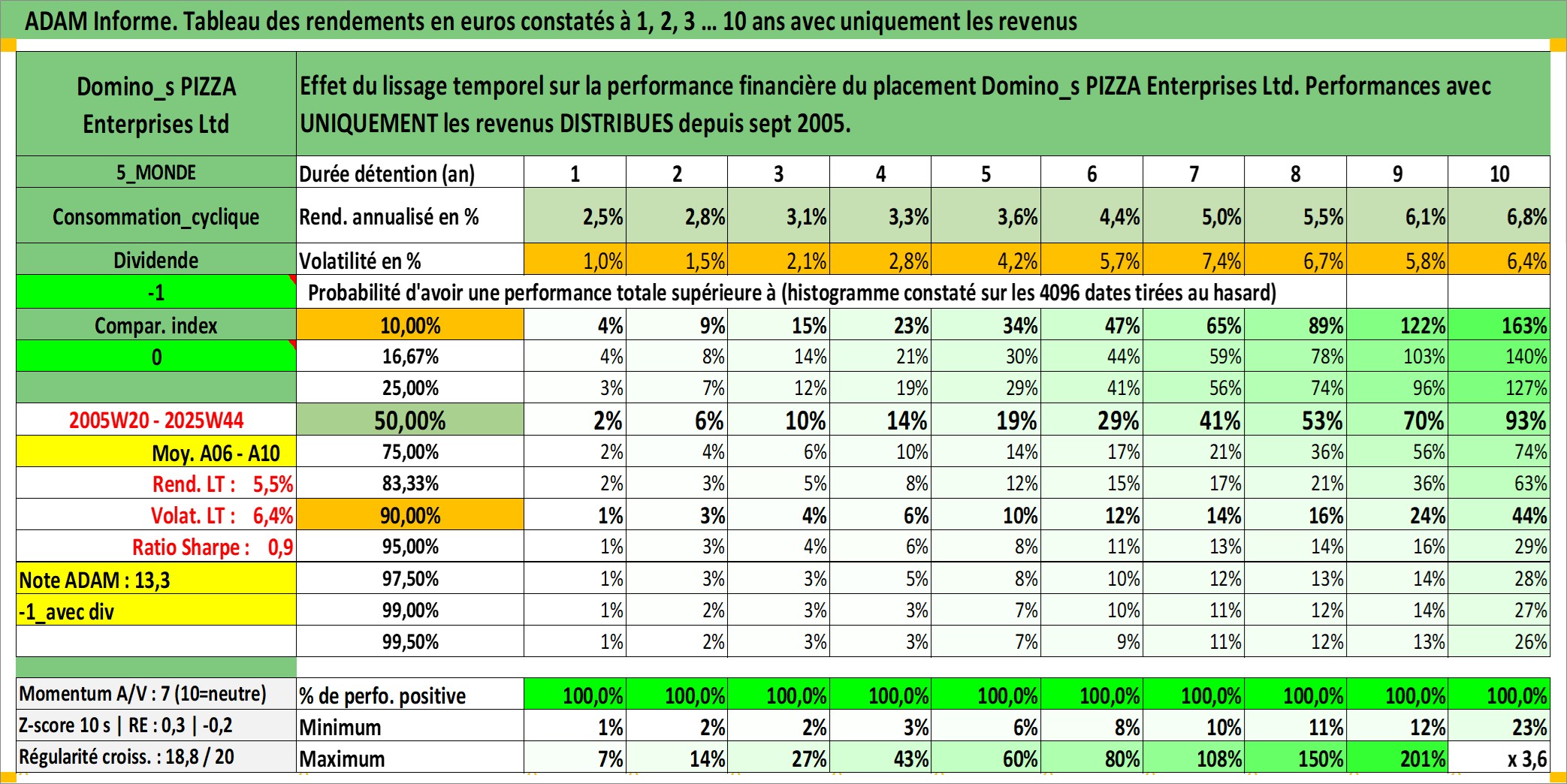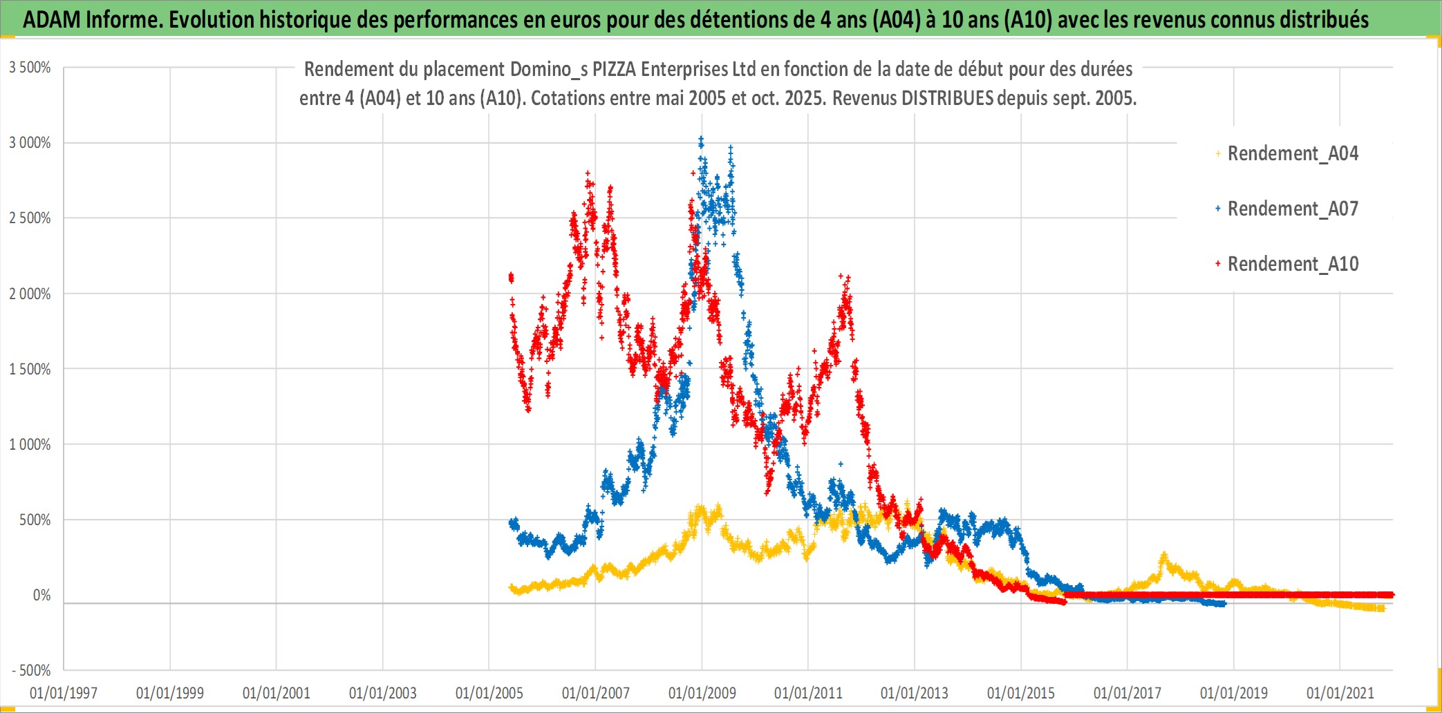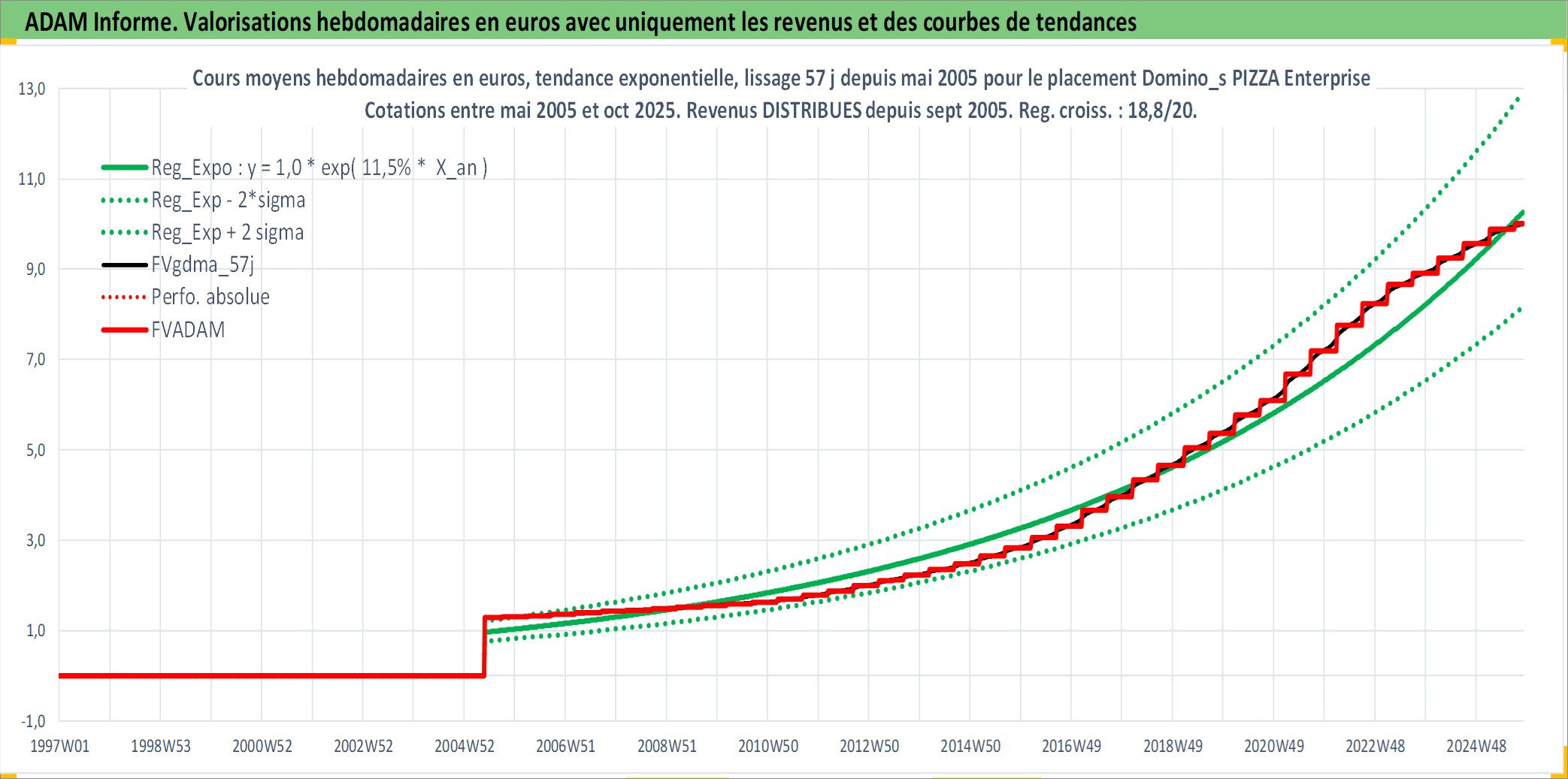 Site dédié aux investisseursPage dédiée sur site financeAnalyse des valorisations hebdomadaires de l'action Domino_s PIZZA Enterprises Ltd. Cet actif est cote en AUD. Les valorisations sont en contrevaleur EURO et couvrent les semaines 2005W20 a 2025W44. Les revenus de cet actif financier sont pris en compte depuis la semaine 2005W39. La note ESG de cet actif n'est pas connue.